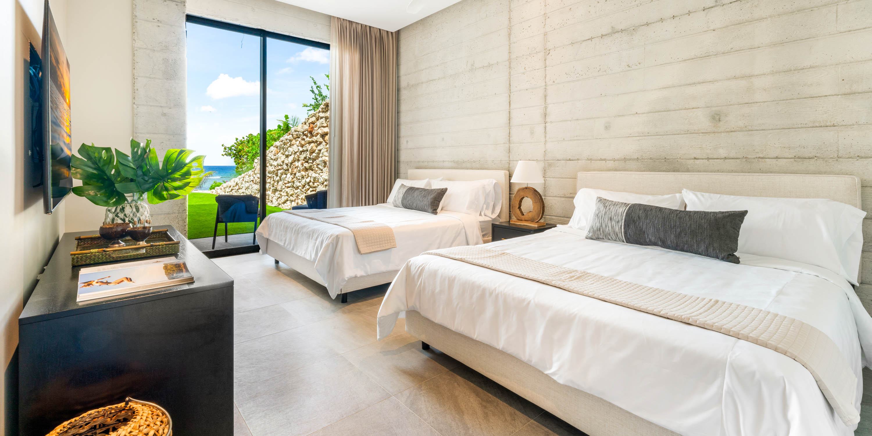 Step inside and you’ll find four oceanfront bedroom suites with floor-to-ceiling views of the Caribbean Sea, two of which feature outdoor showers set against natural Cayman rock. Additional twin-bedroom suites with private entrances provide flexible options for guests, family, or staff. The Great Room is the heart of the villa, with a 14-person dining table, a gourmet double-island kitchen, and expansive windows that frame the azure waters.