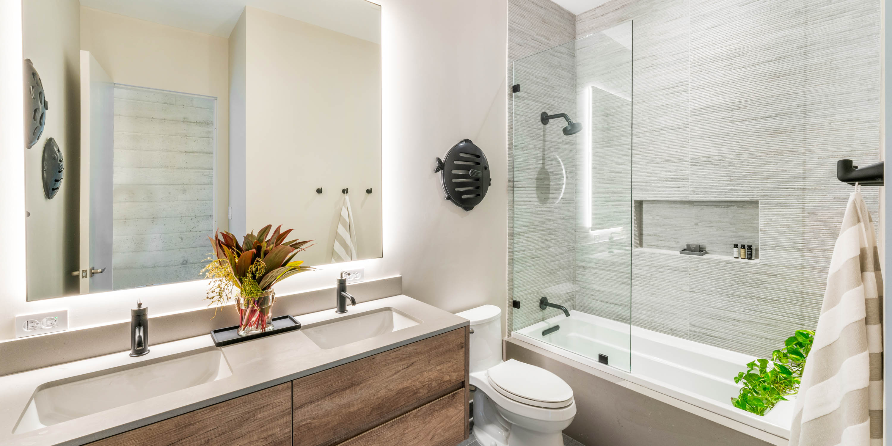 - Suite 1 - upper-level, king bed, oceanfront, television, coffee + beverage hub, mini-fridge, sofa seating, desk + chair, walk-in closet, ensuite with double vanity, beauty counter, rainfall shower with water wand, plus a private outdoor shower.