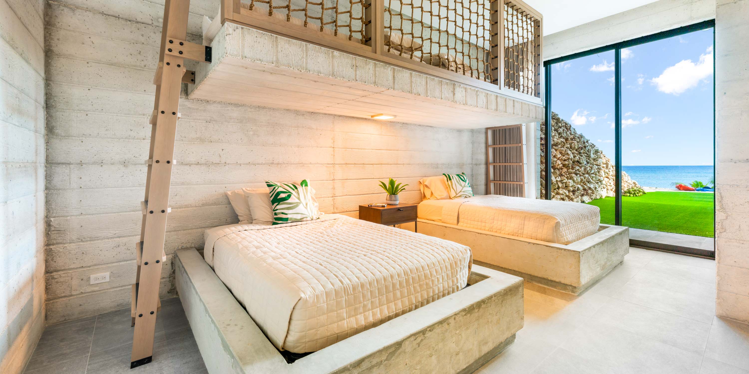 - Suite 8 - lower level, two full beds + two twin loft beds, oceanfront, walk-out access to the pool deck, television, ensuite with double vanity, and shower bath.