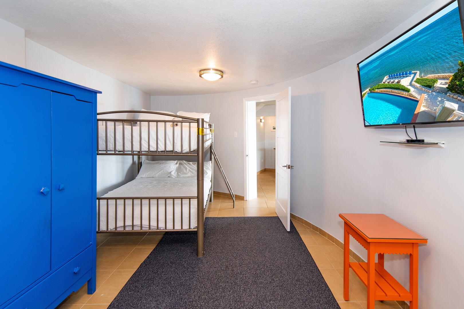 - Family Suite – second-floor, king bed + bunk beds, ensuite with shower.