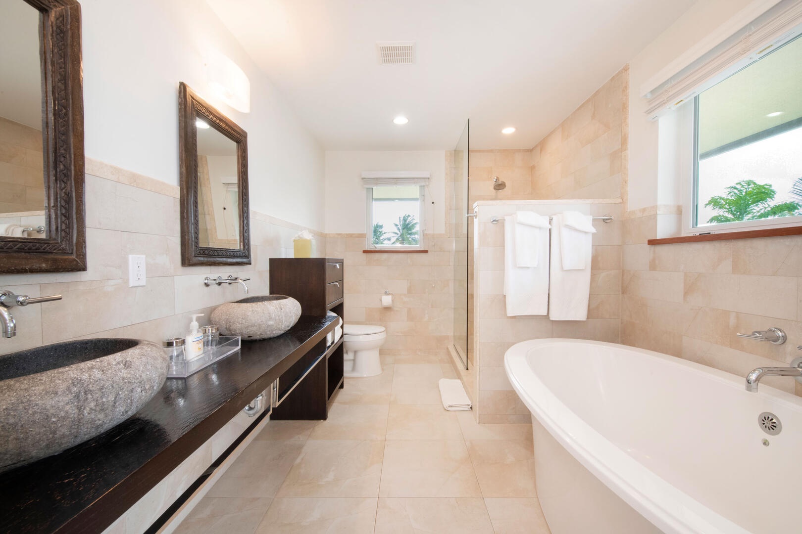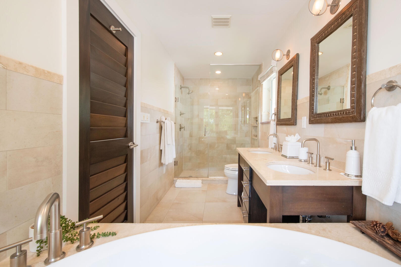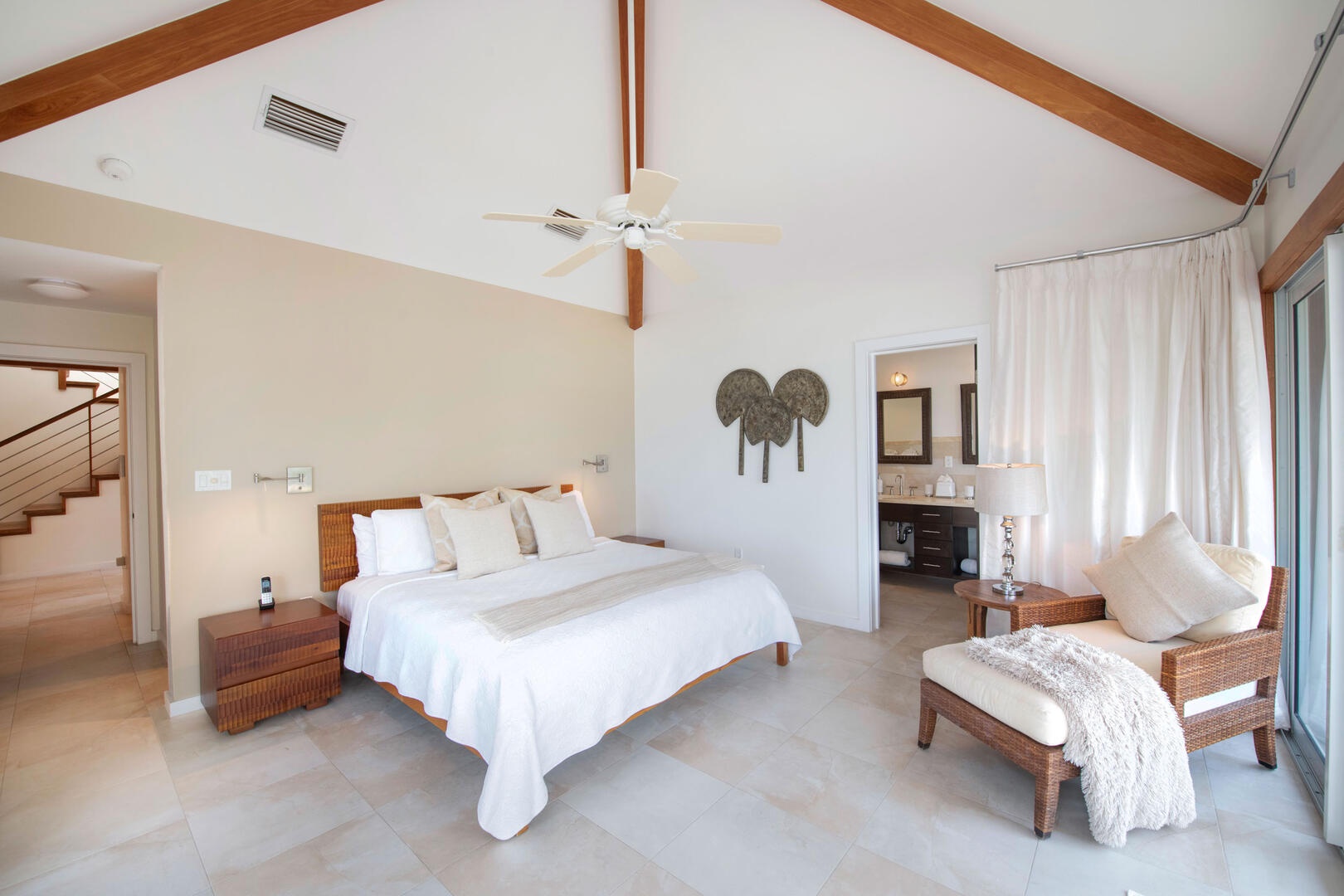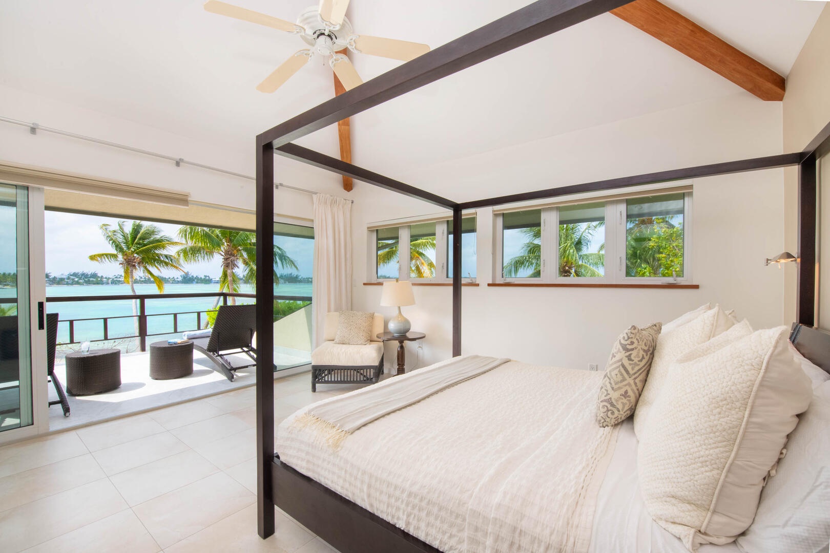 - Bedroom 1: primary suite, upper-level, oceanfront, king bed, walkout access to a private furnished balcony, walk-in closet, ensuite with dual vanity, soaking bathtub, and separate shower.