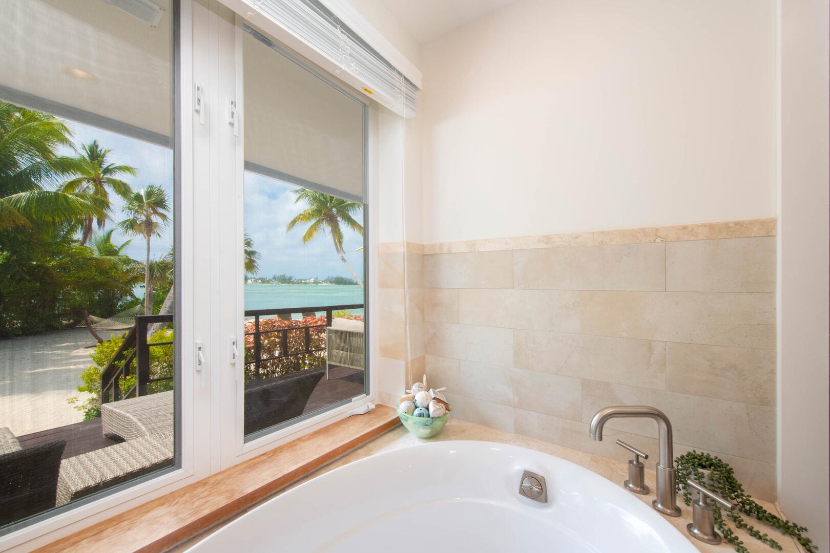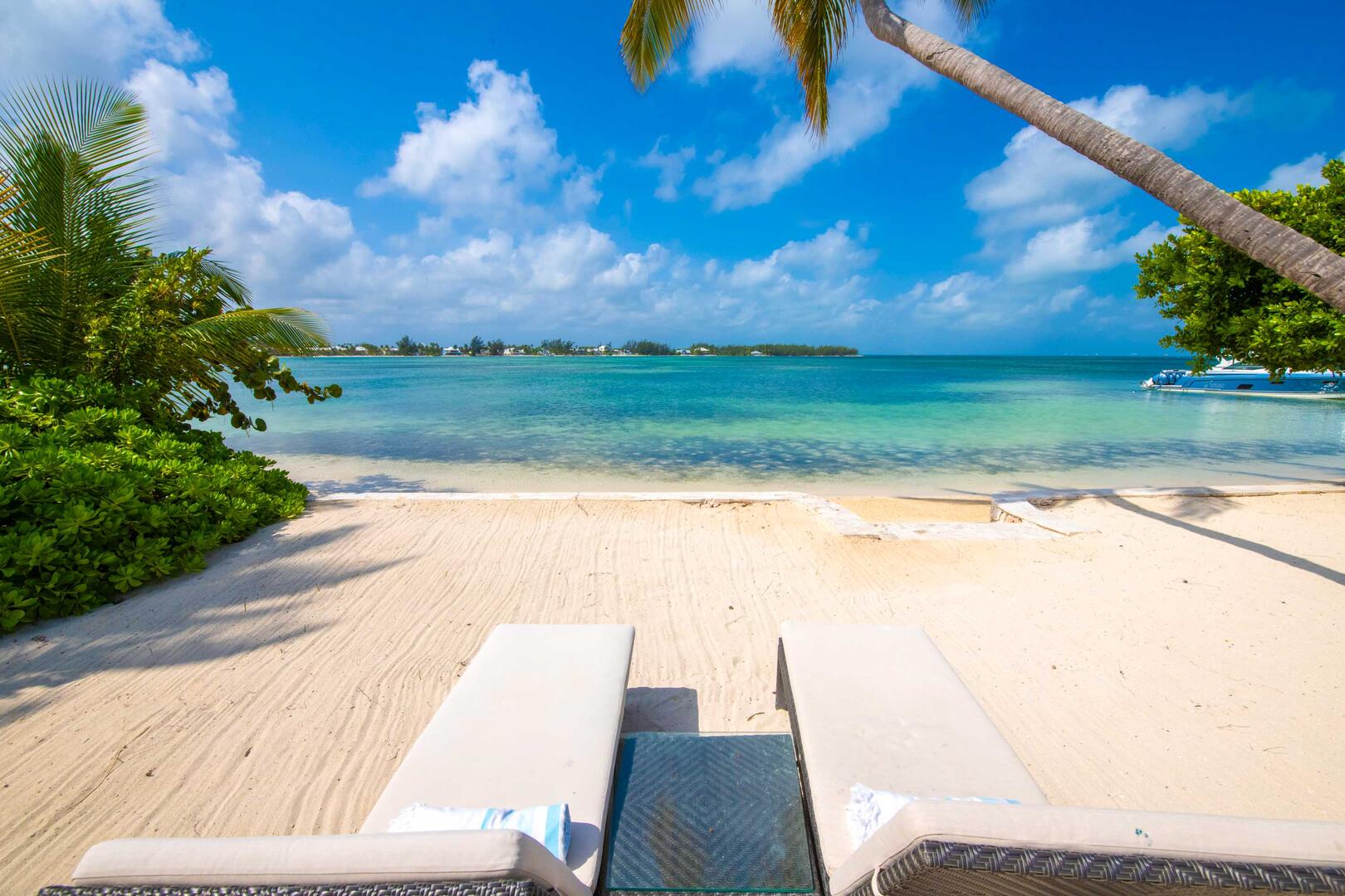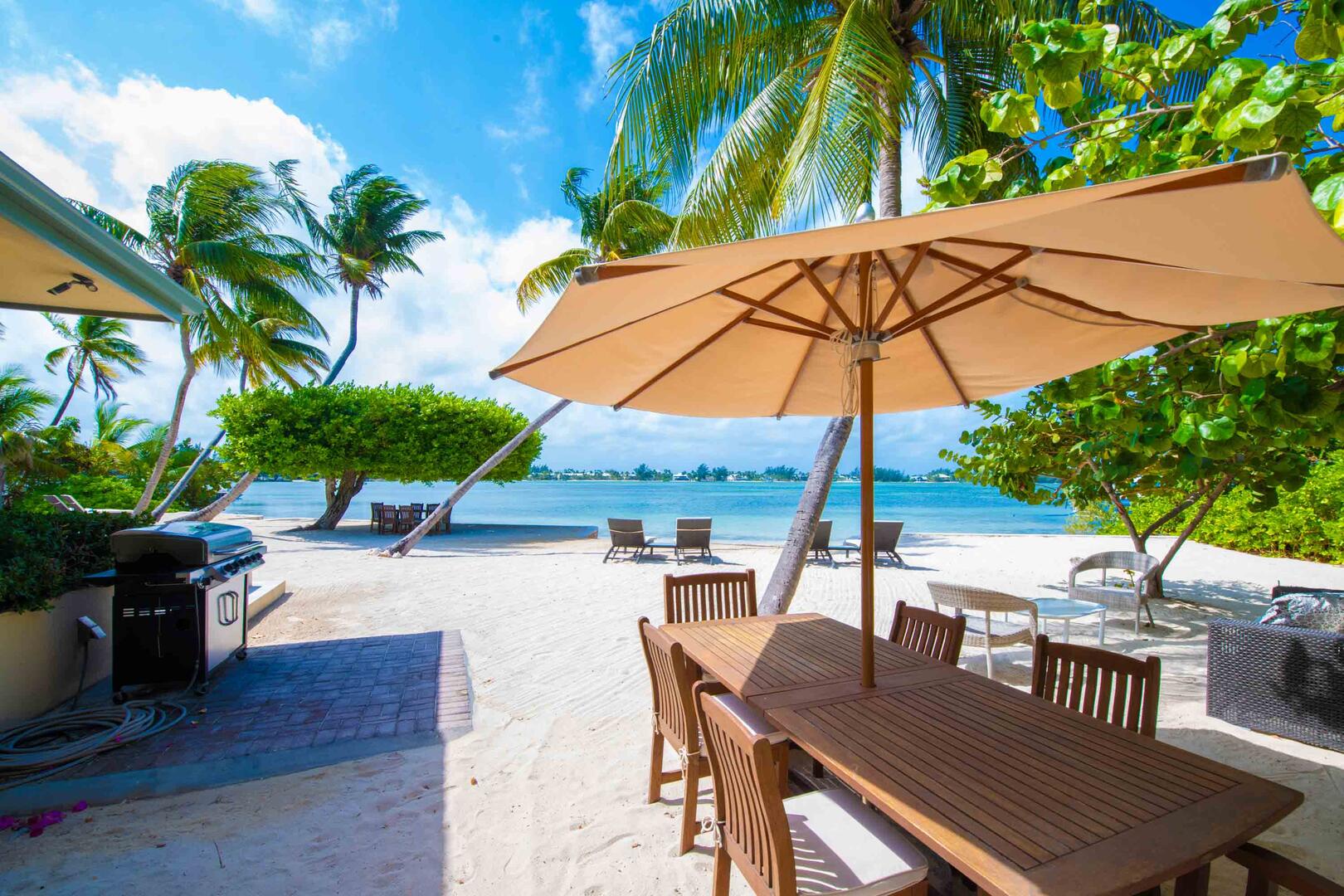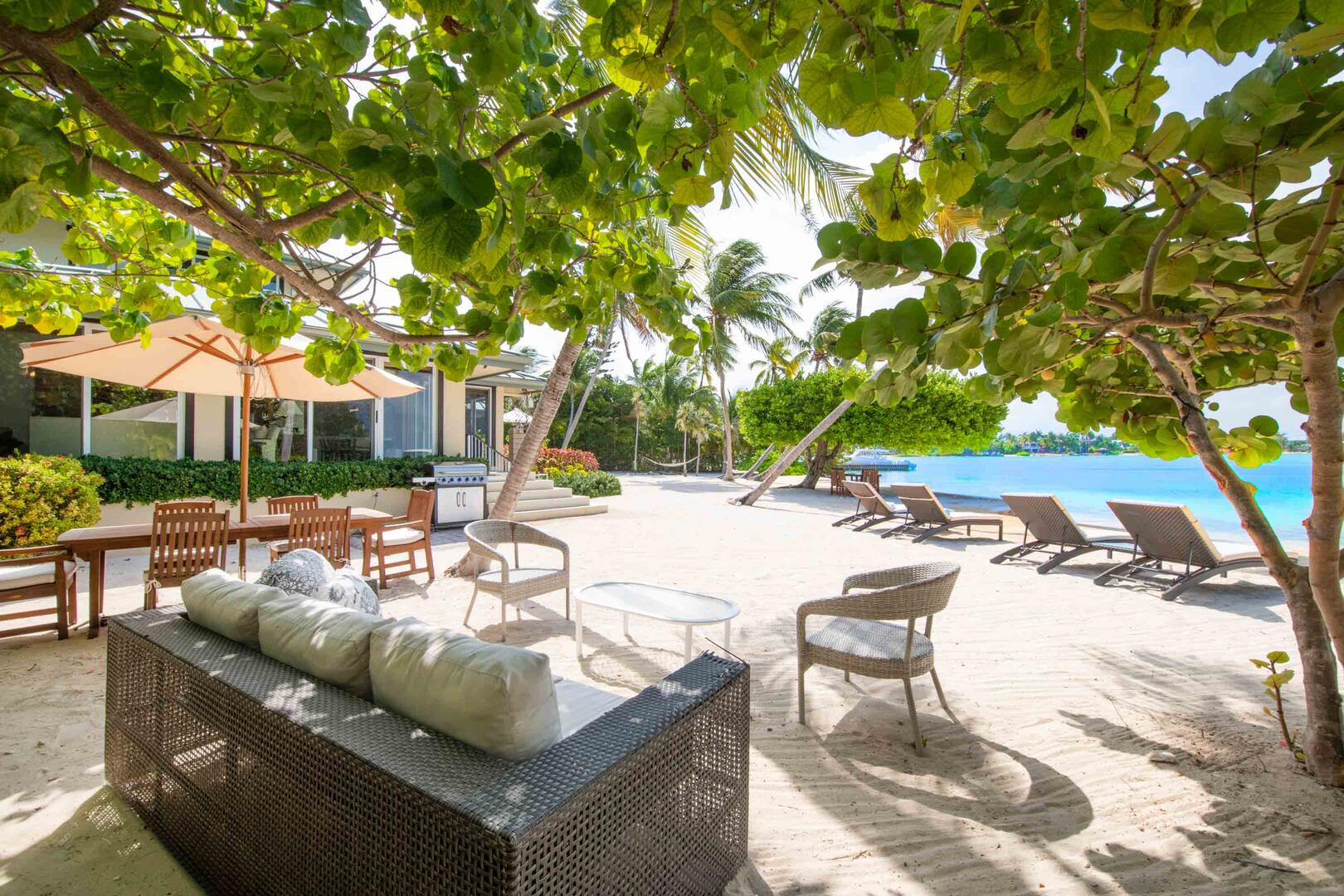 - Barefoot swimming beach just steps from the back door with lounge chairs, palm-shaded hammock, and propane grill