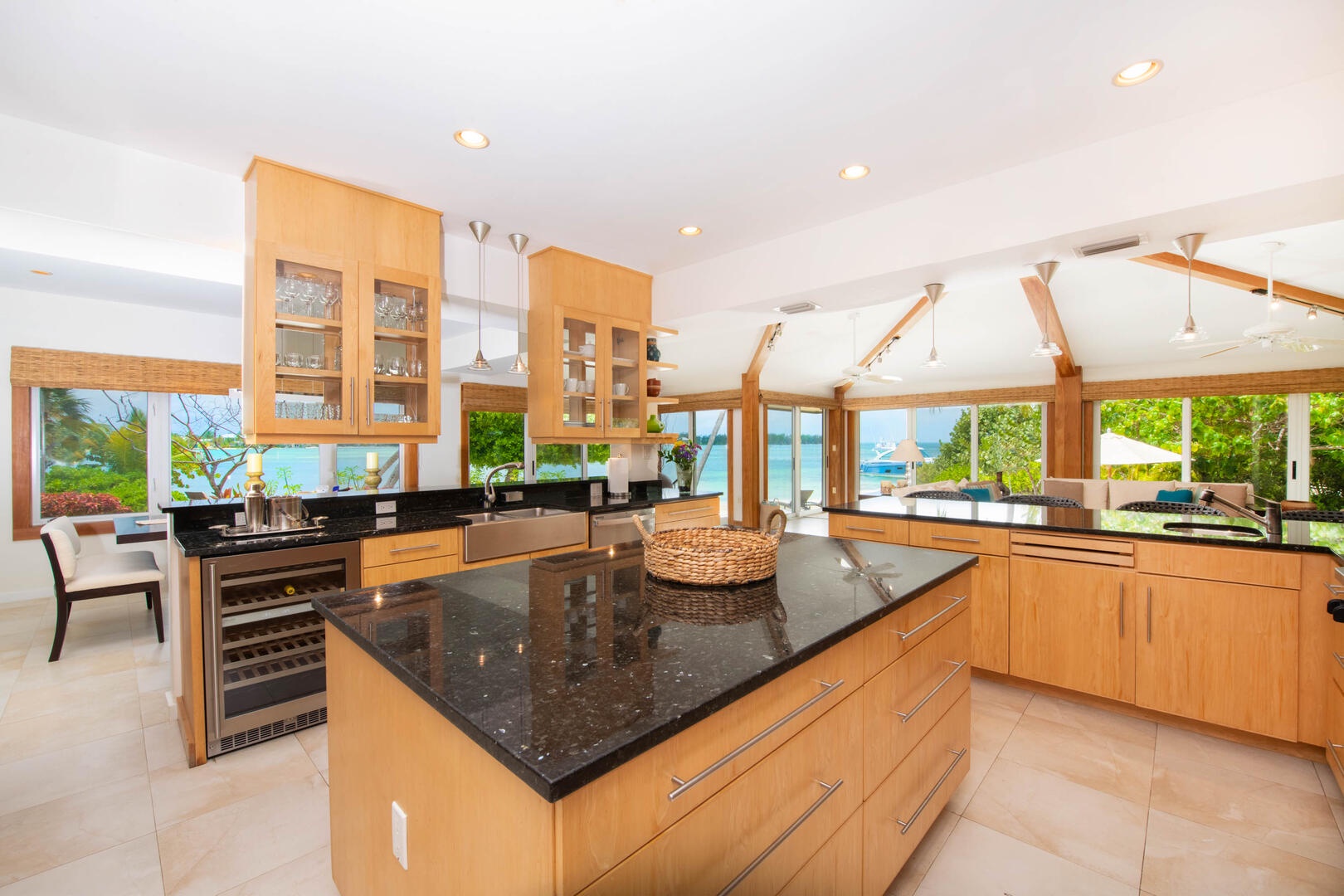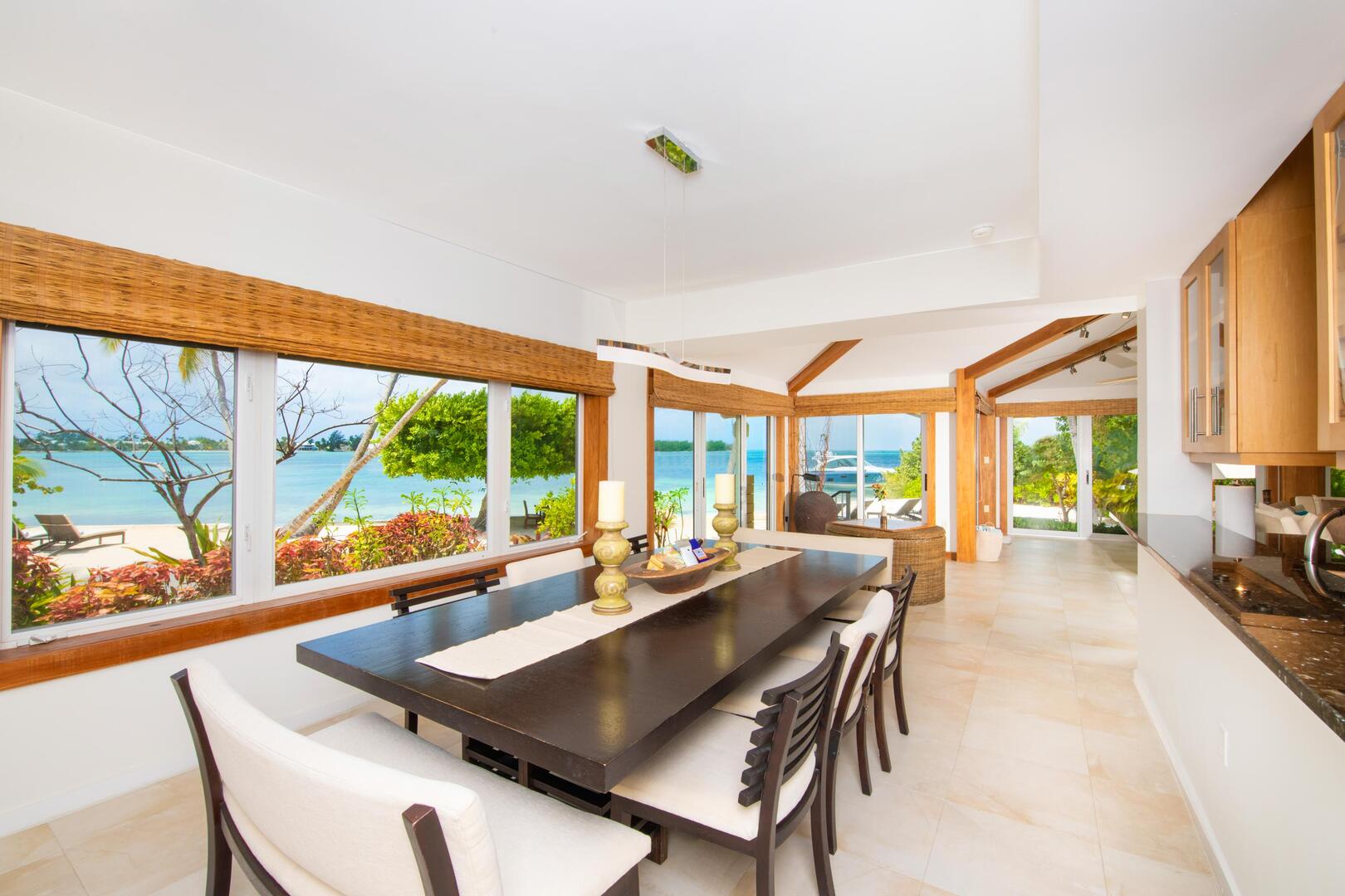 Plenty of oceanfront windows and sliding doors fill the living area, kitchen, and bar with sunlight and panoramic views of the azure waters off of Cayman Kai. The fully equipped, modern kitchen offers all the standard appliances, dishware, cookware, and cutlery.