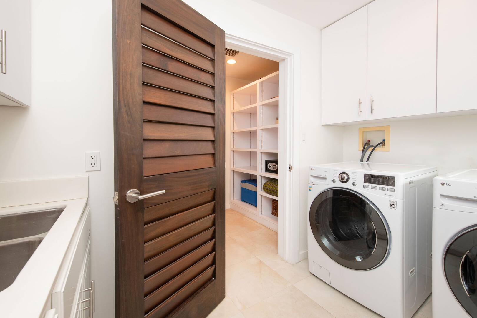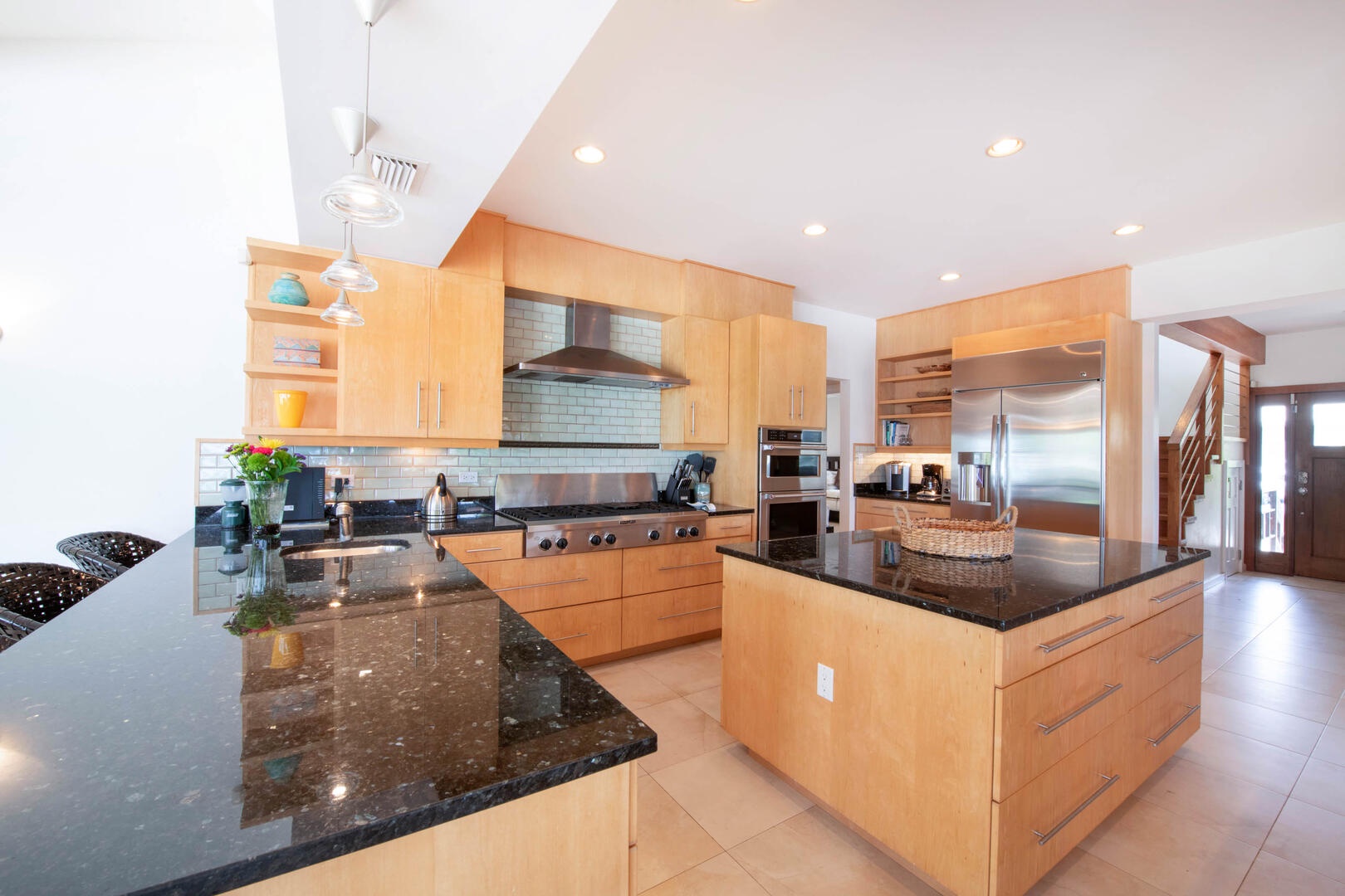 - Fully equipped, gourmet kitchen with granite countertops, island stove, double-oven, large stainless steel sink, dishwasher, and wine cooler