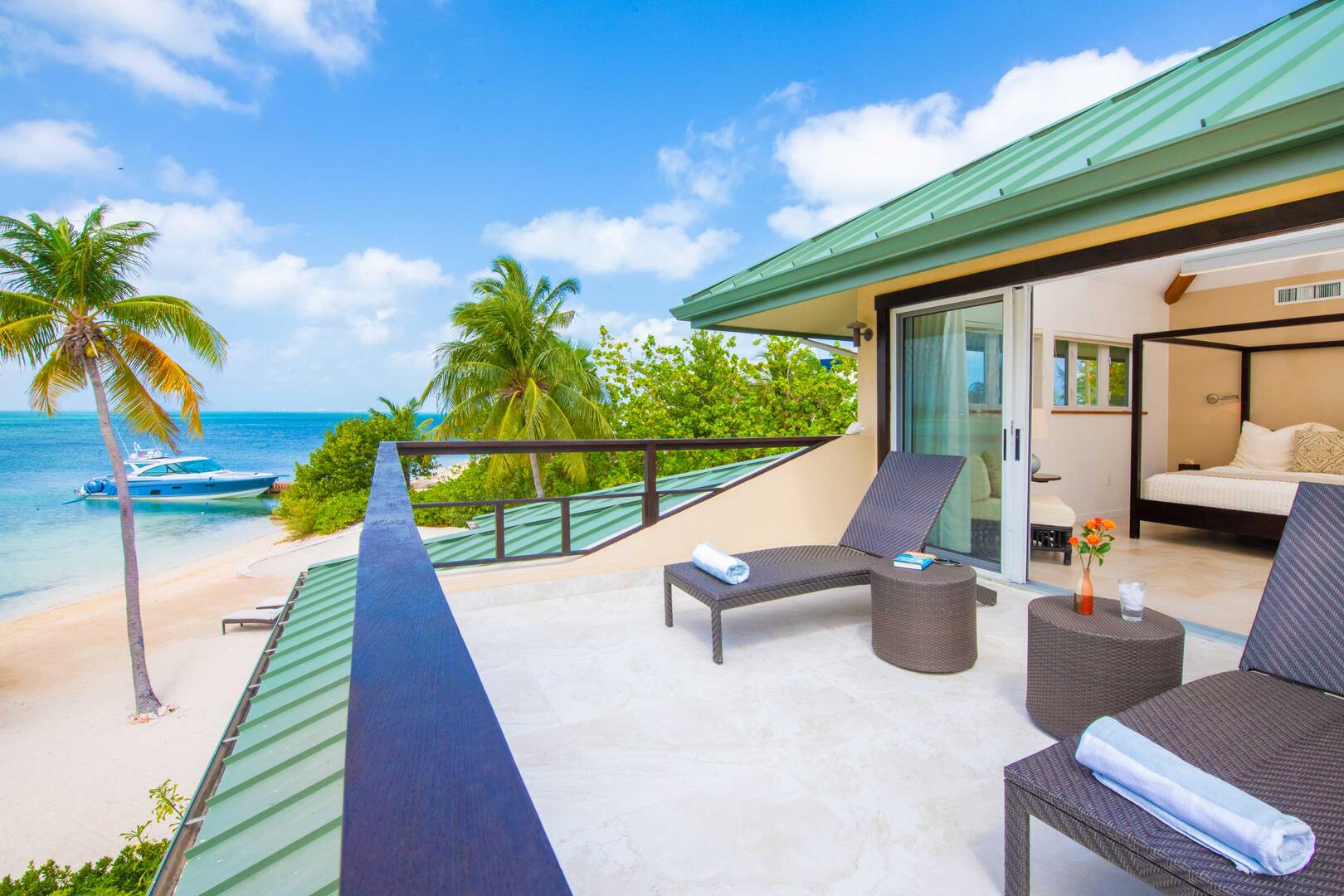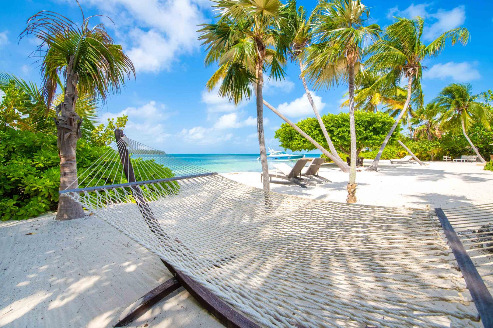 The white sand beach not only offers barefoot swimming but also has lounge chairs, a palm-shaded hammock, and a propane grill for cooking by the sea.