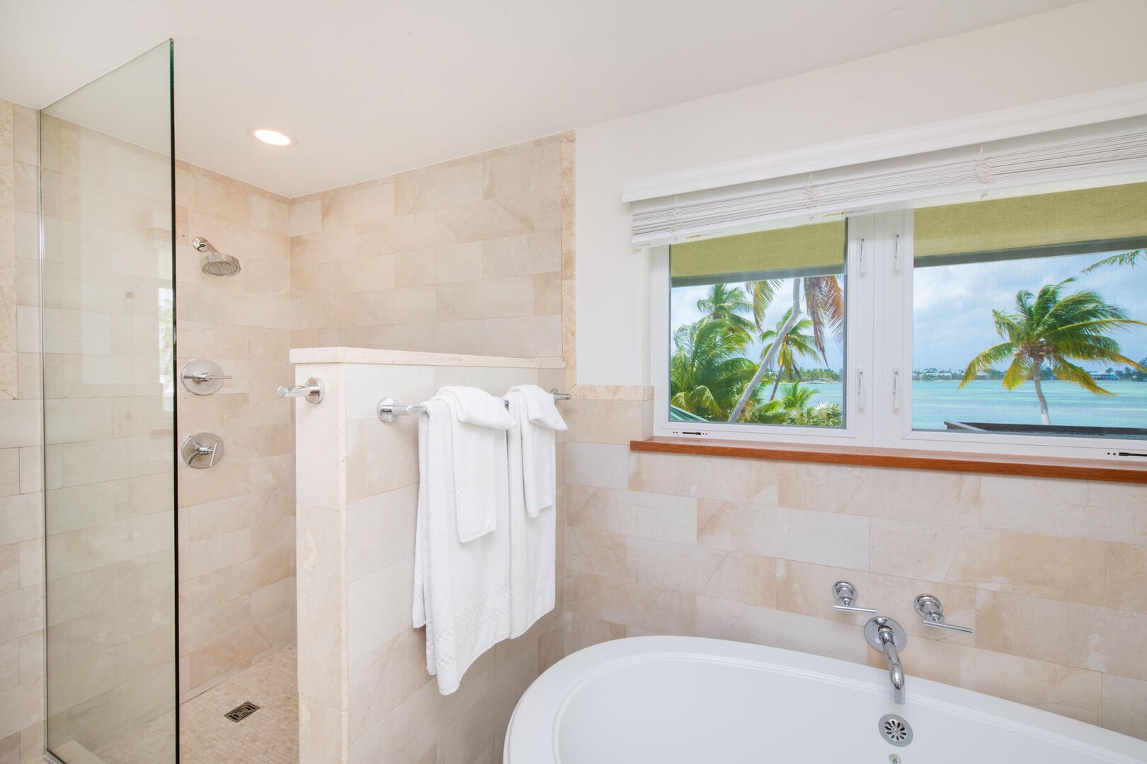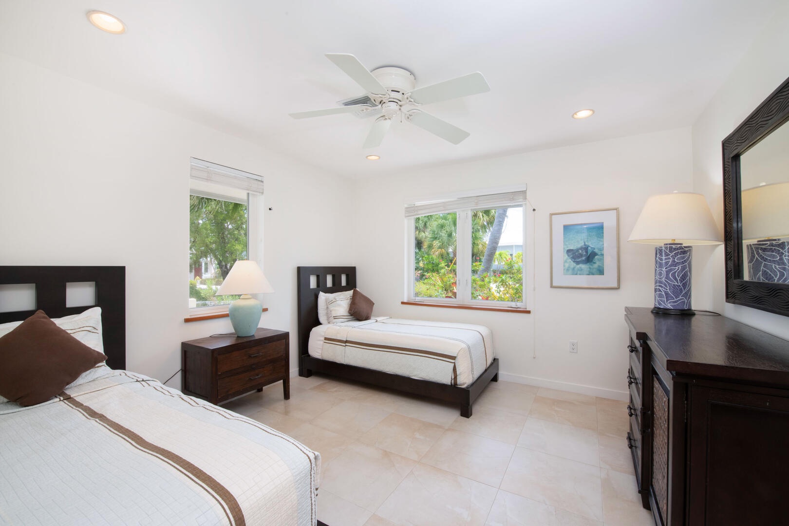 - Bedroom 4: lower level, island views, two twin beds, shares adjacent hall bathroom equipped with a shower; twin beds can be fitted into a king bed upon request.