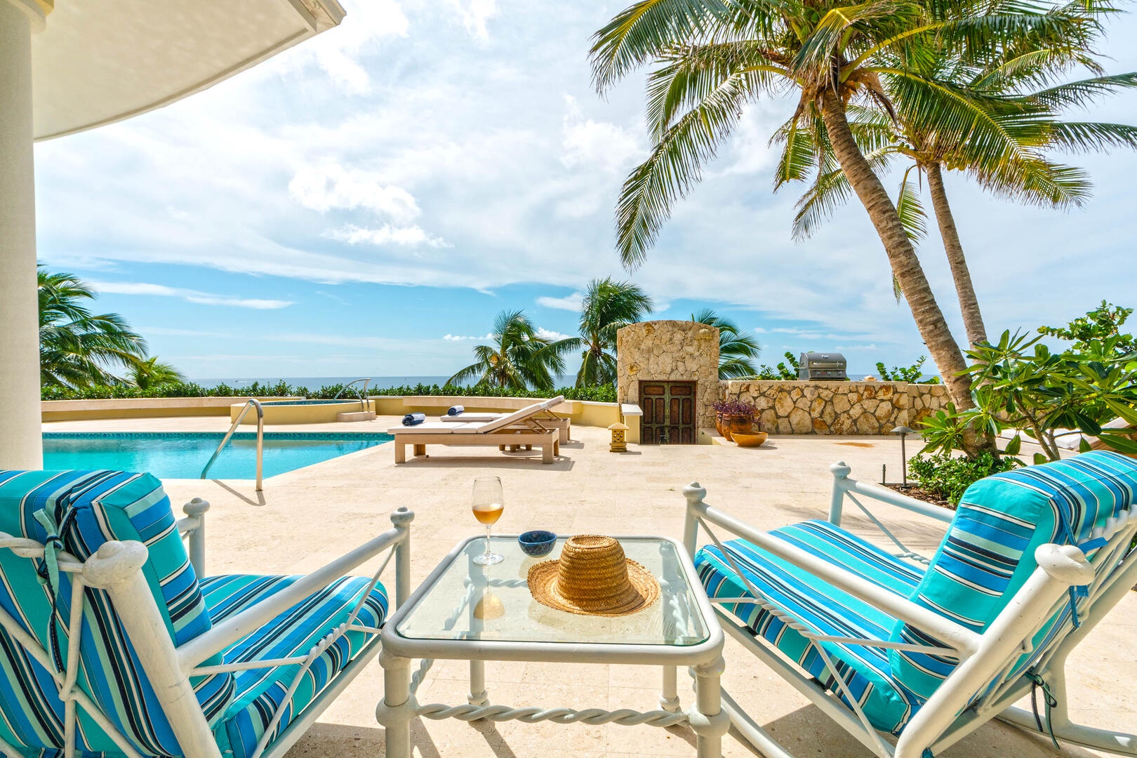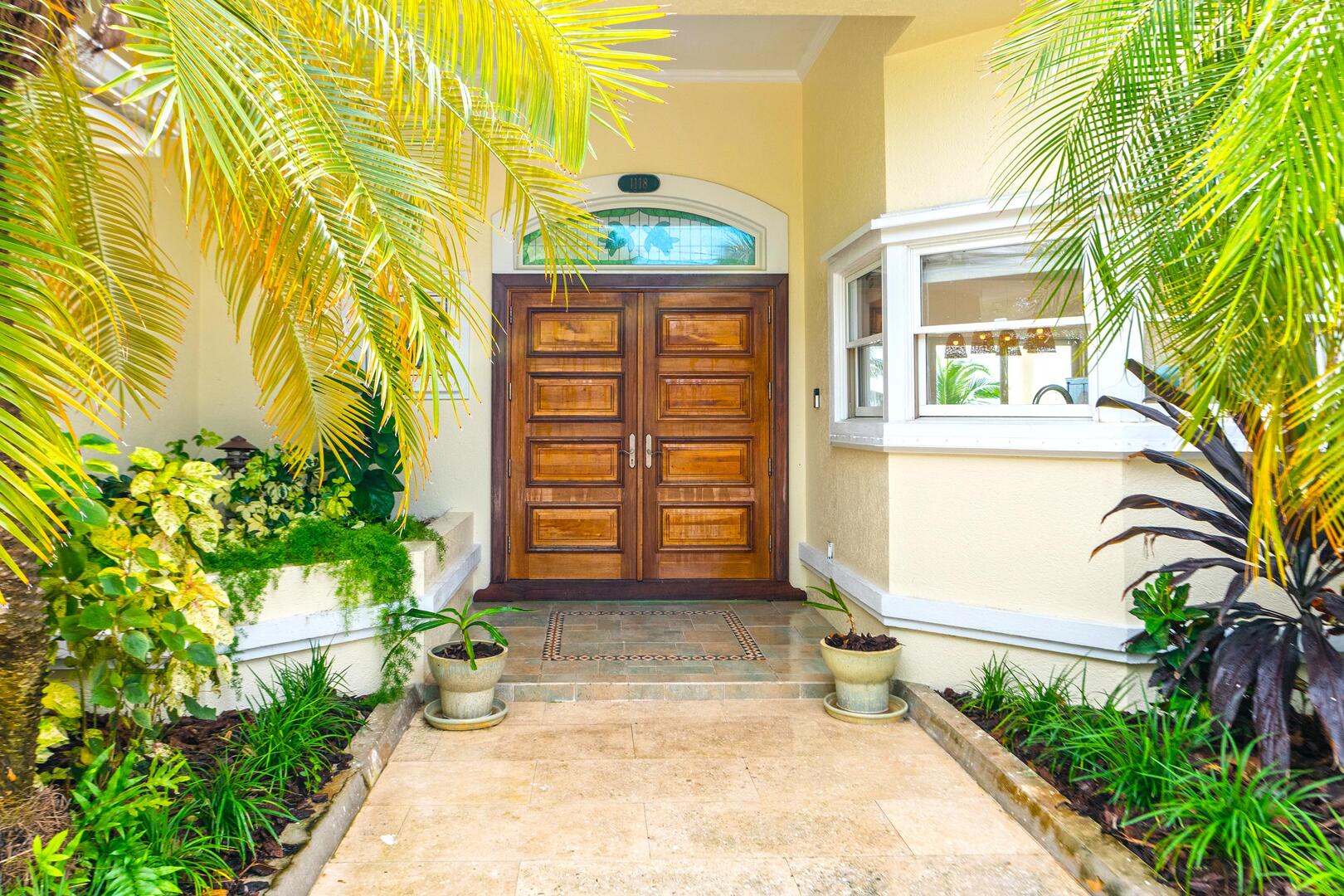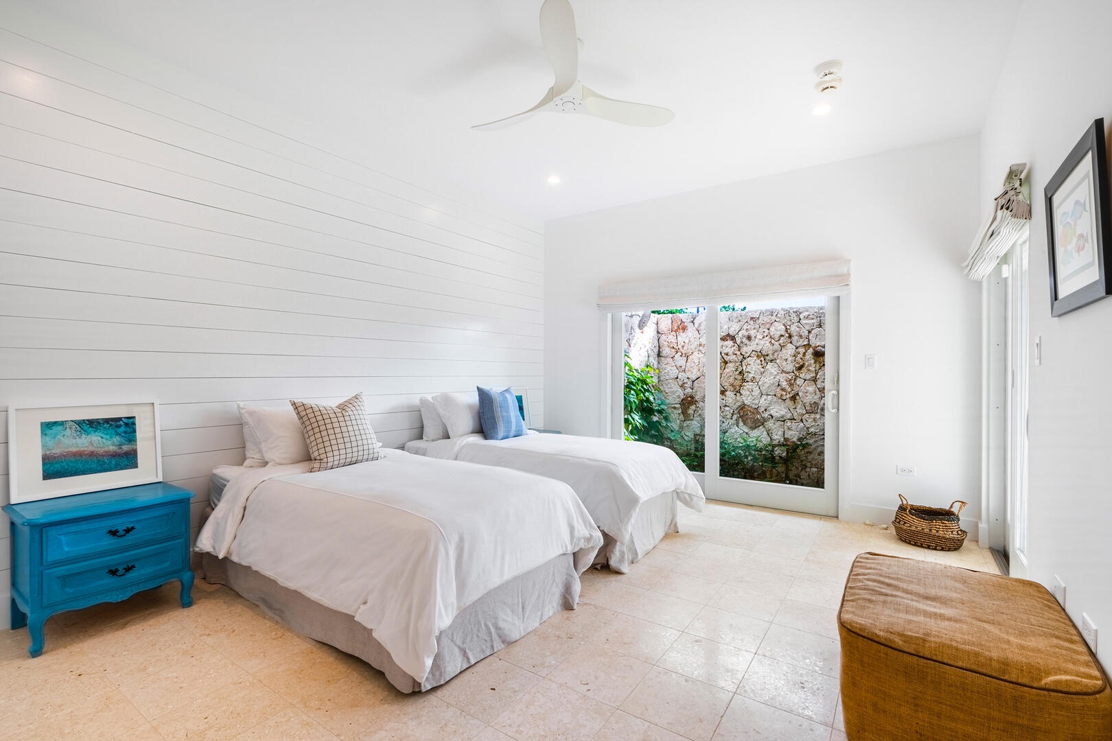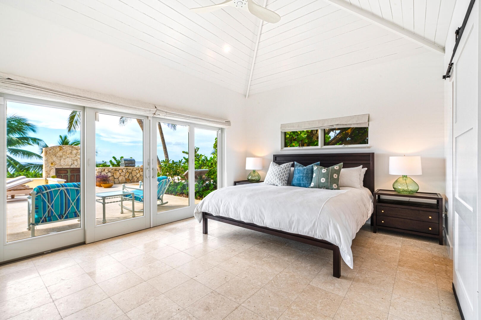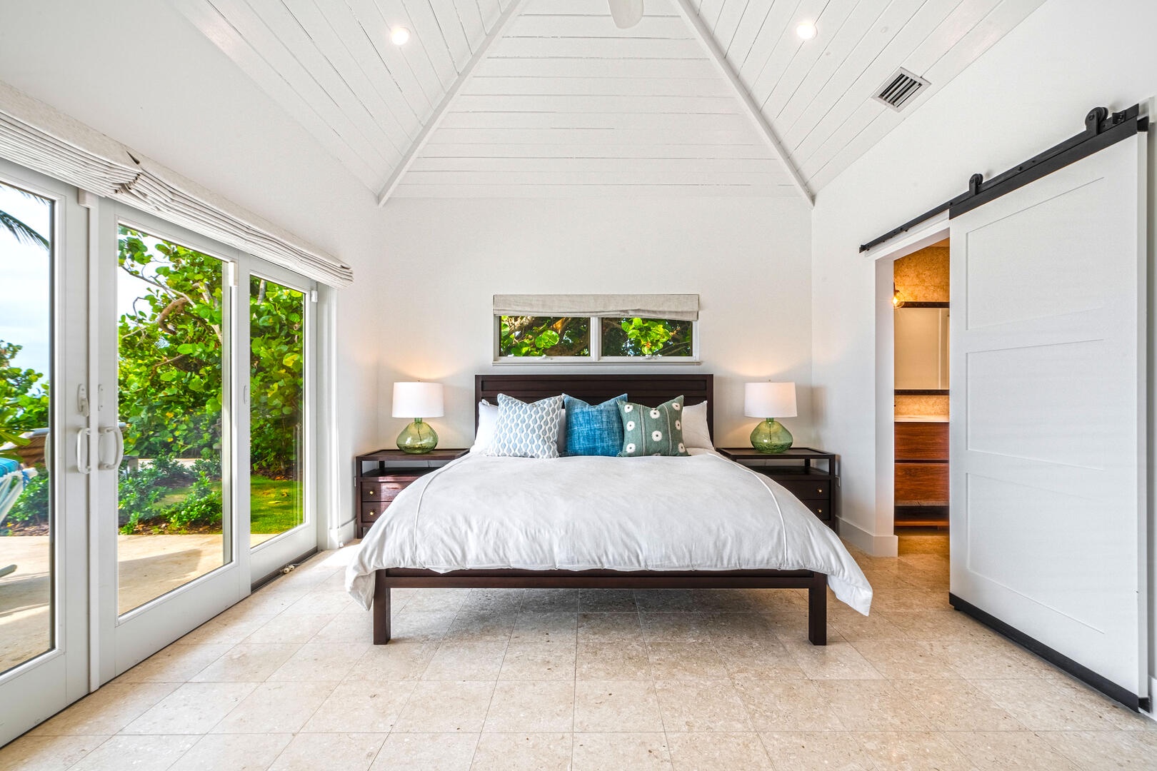 Beach access from the pool deck is via a pair of Moroccan-painted doors leading to a private path under a canopy of sea grape trees, out onto barefoot white sand.