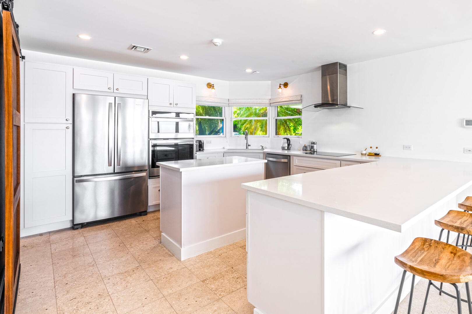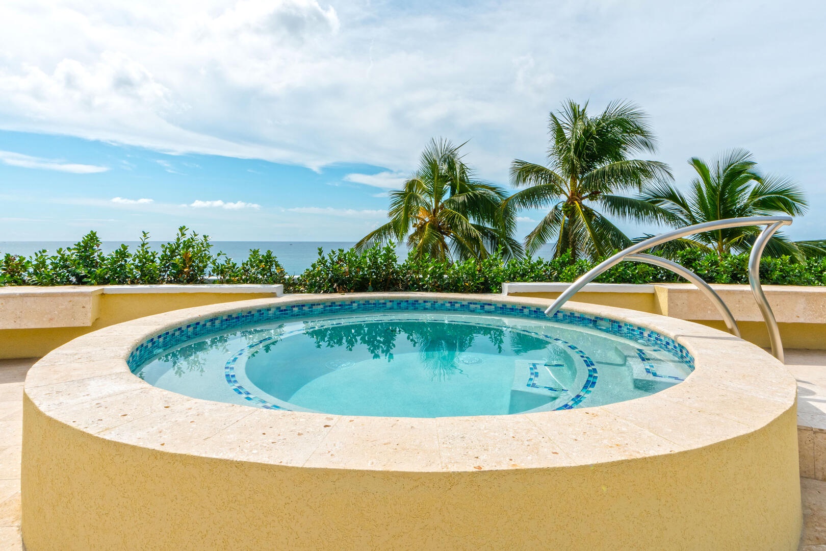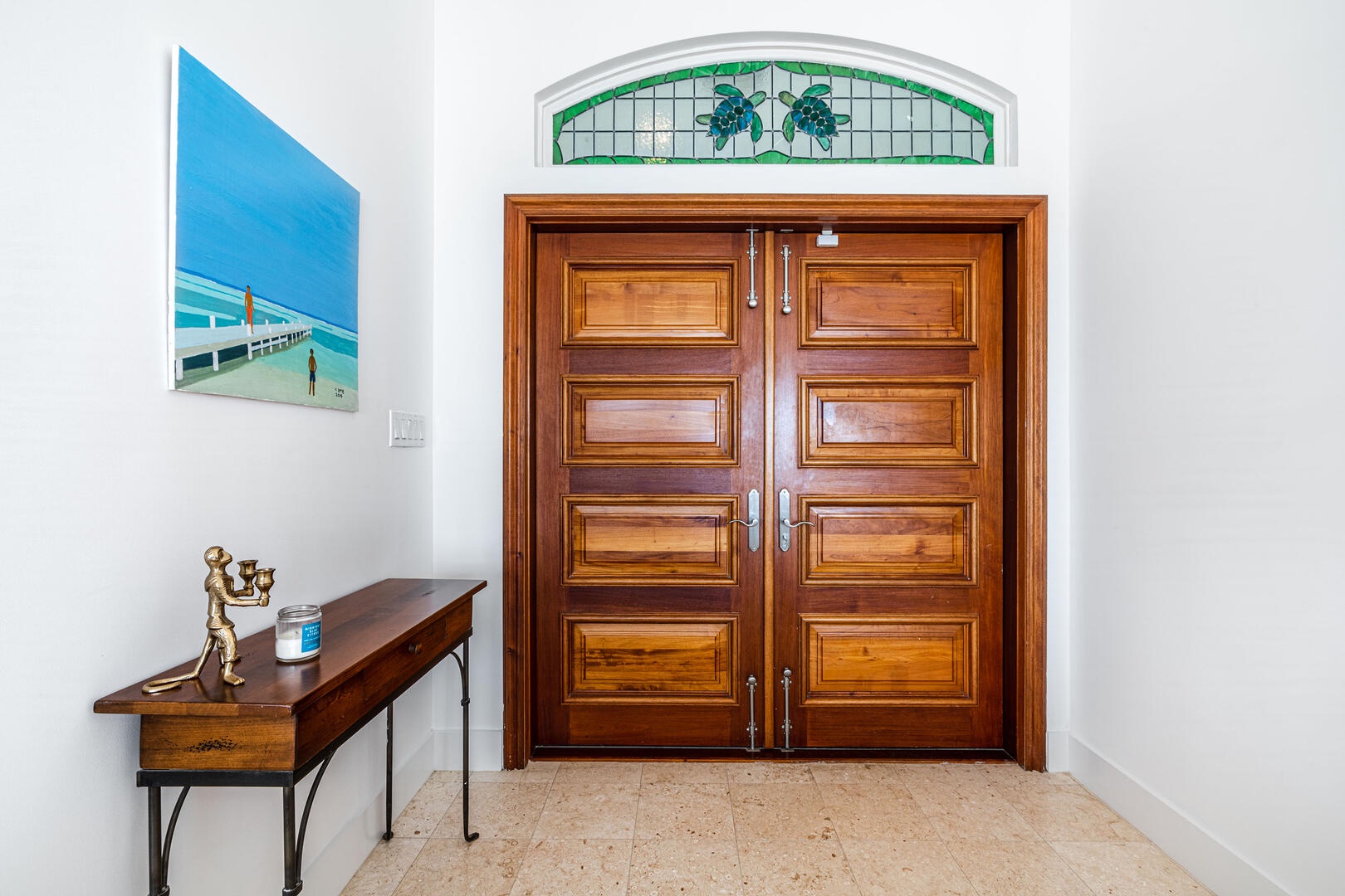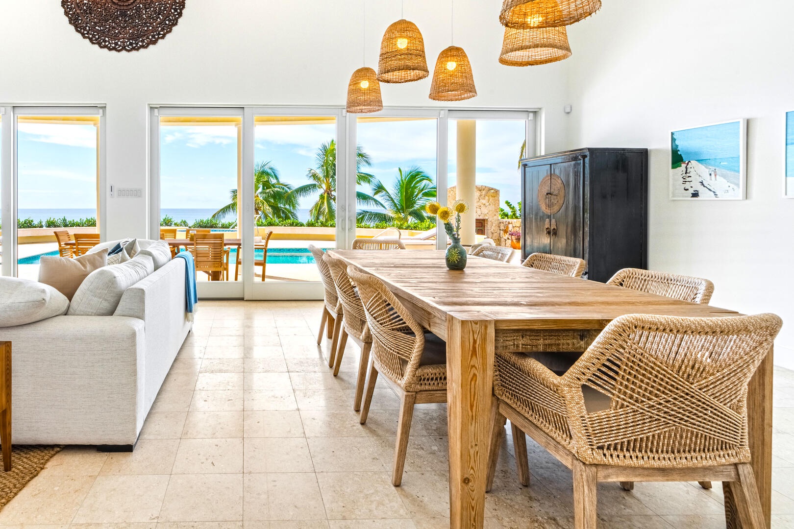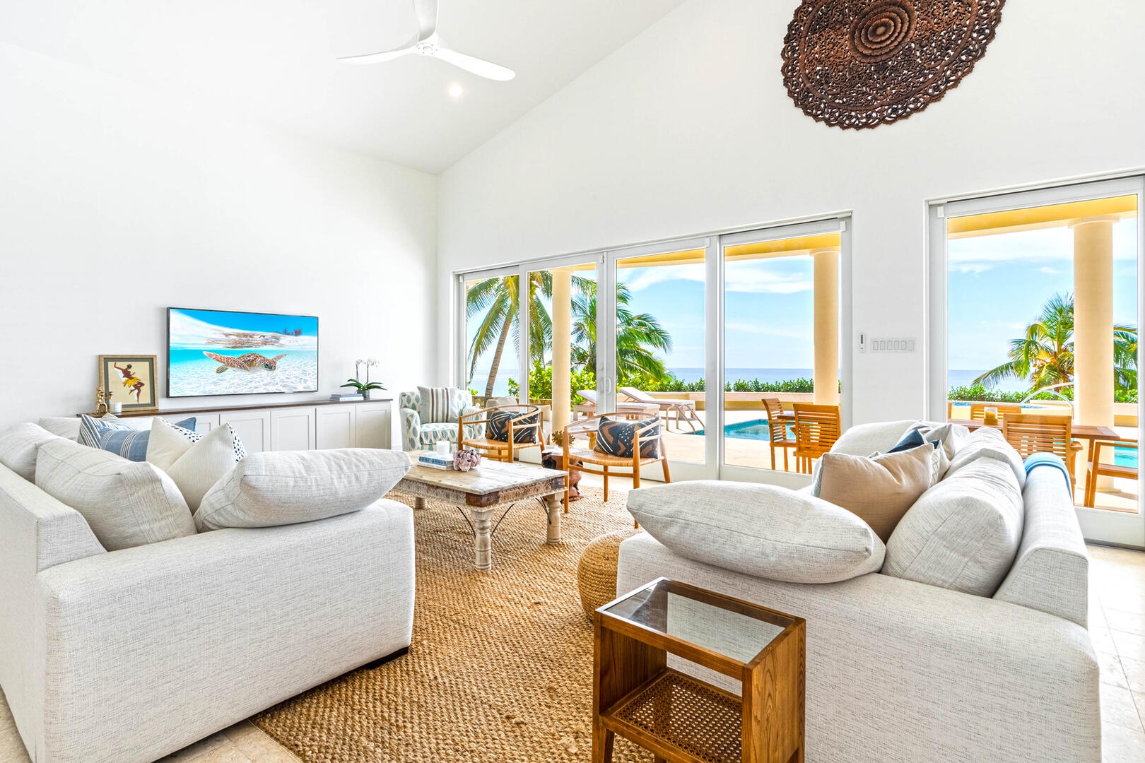 Beach access from the pool deck is via a pair of Moroccan-painted doors leading to a private path under a canopy of sea grape trees, out onto barefoot white sand.