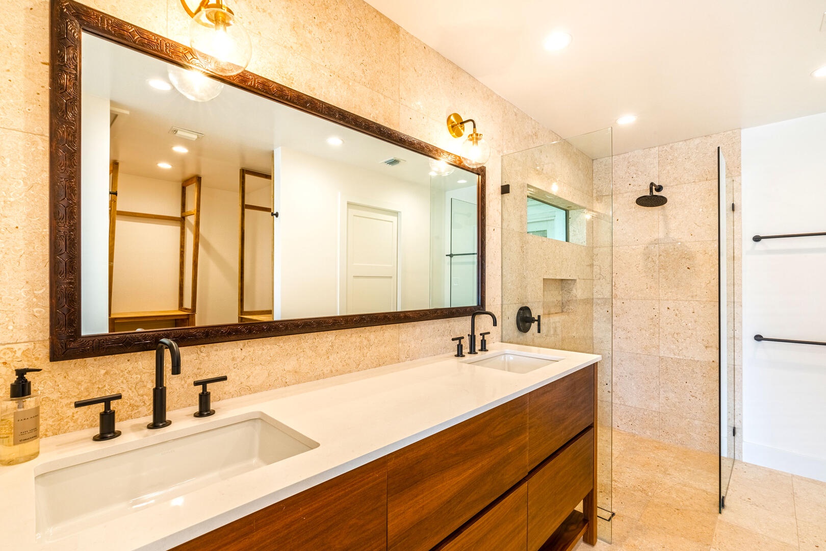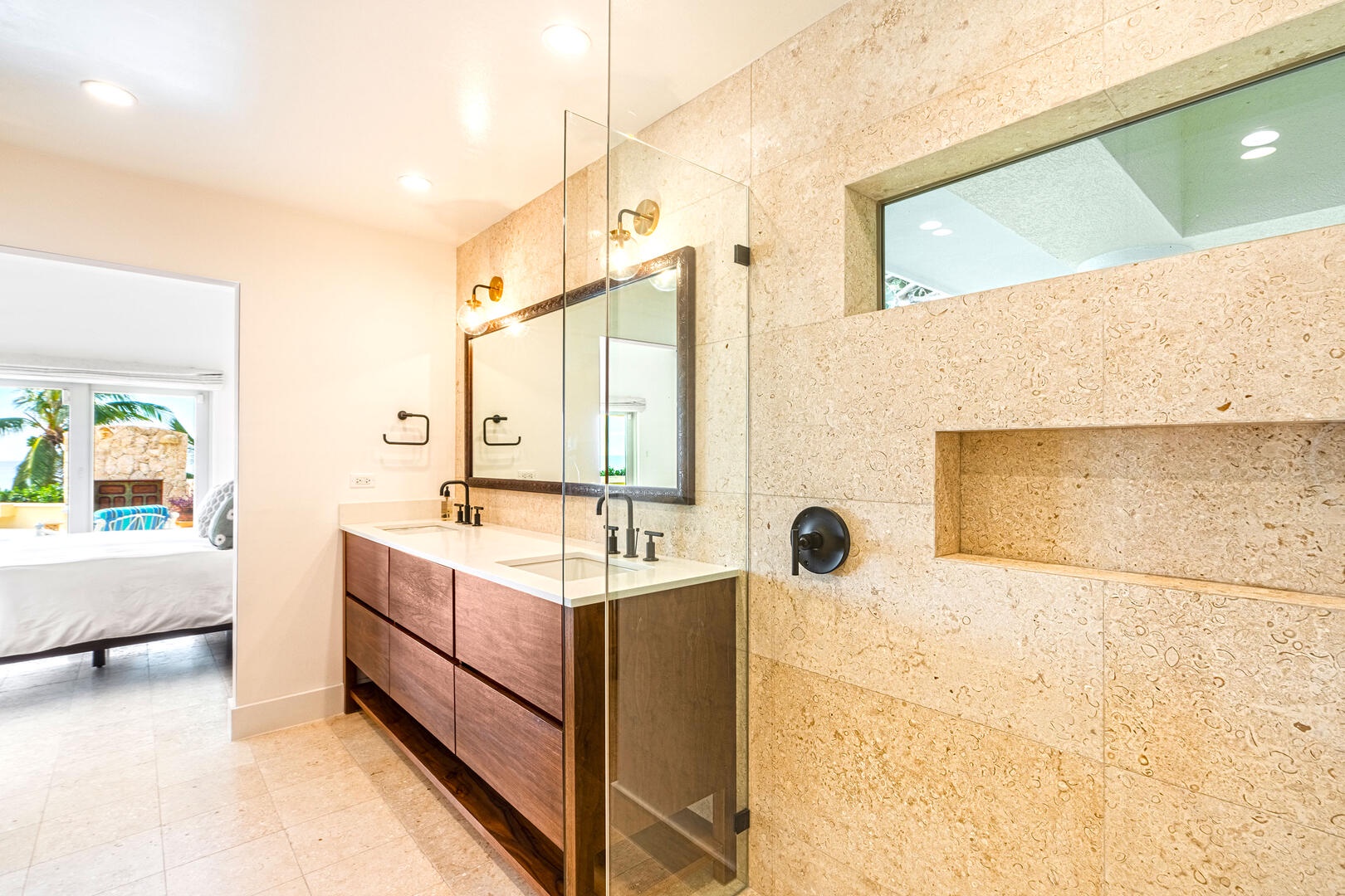 - West Master Suite - king bed, oceanfront views, walk-out access to the pool deck, ensuite bath with double vanity and walk-in shower.