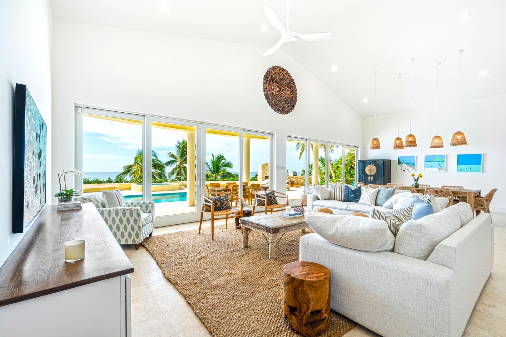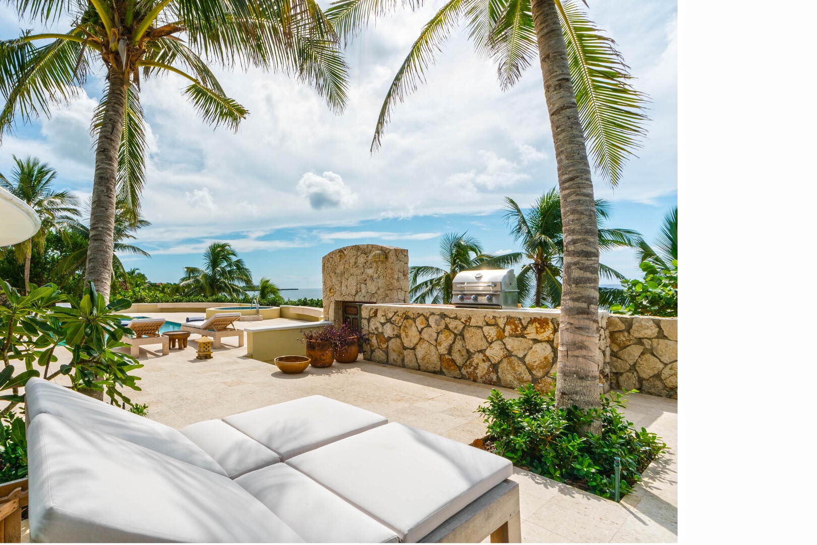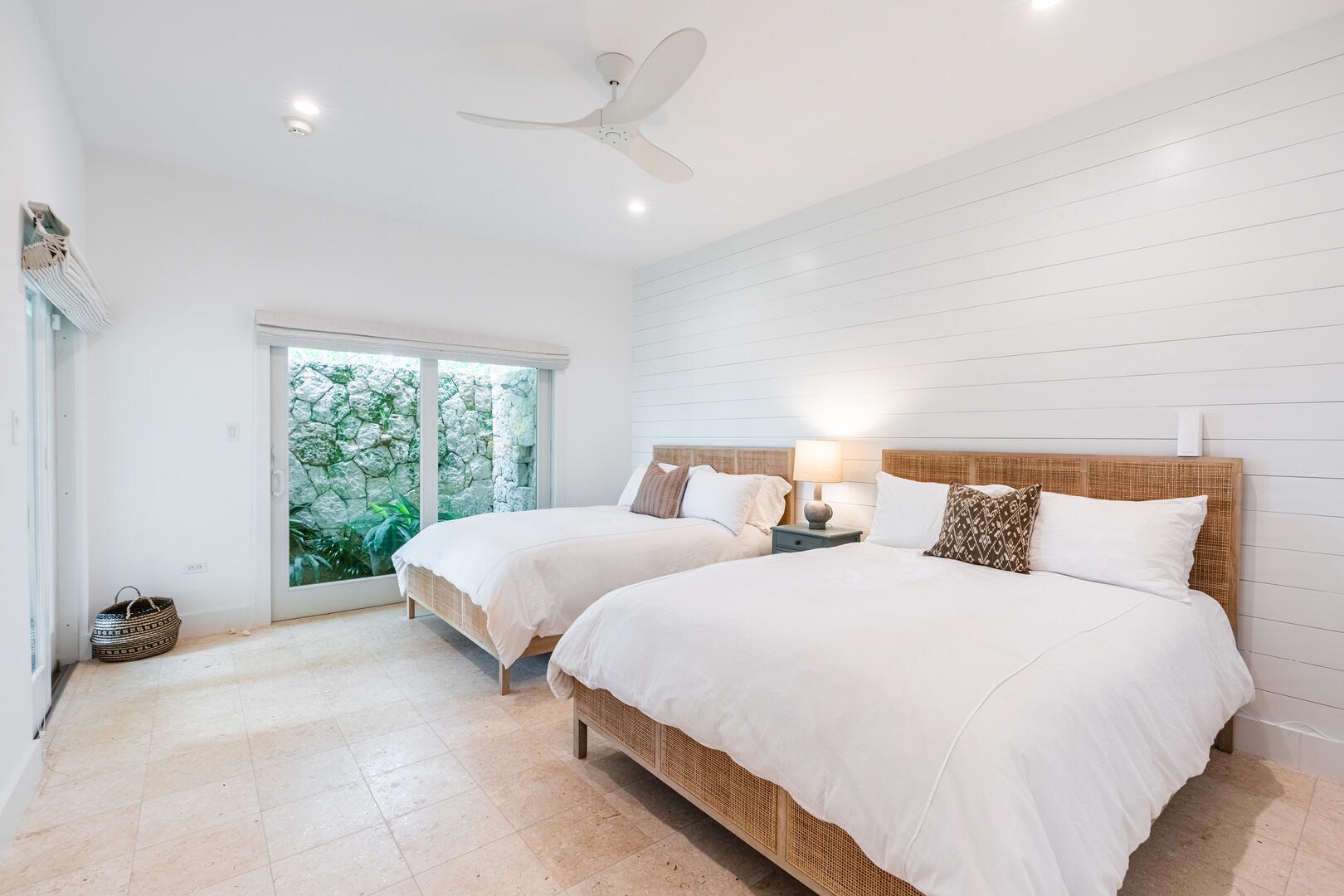 Each of the four-bedroom suites enjoys elevated ceilings and scenic ocean views. Spacious modern ensuite bathrooms for all. The oceanview twin and queen suites each have an outdoor enclosed rock-walled private shower. Guests will find plenty of room throughout the villa to spread out and relax in style.