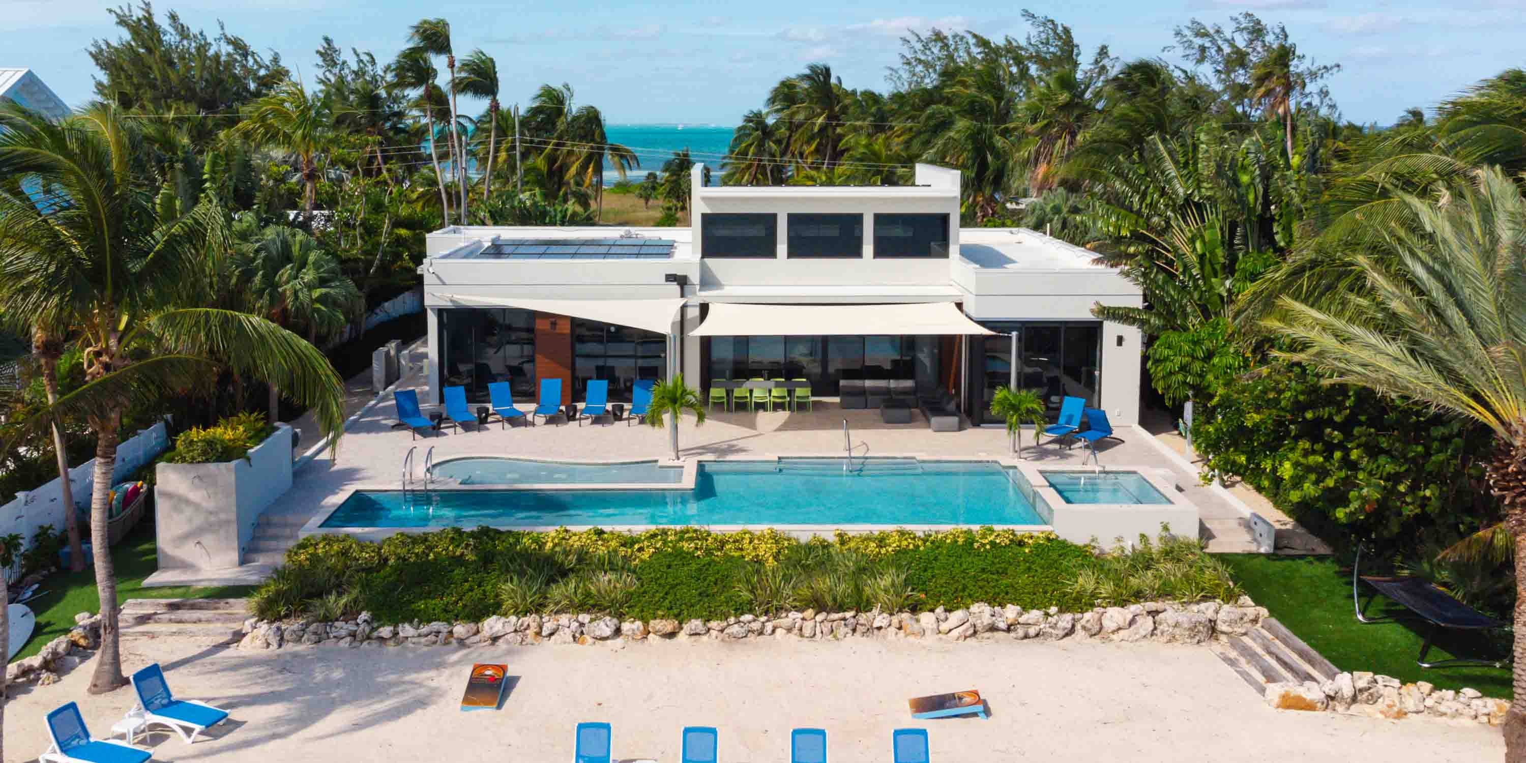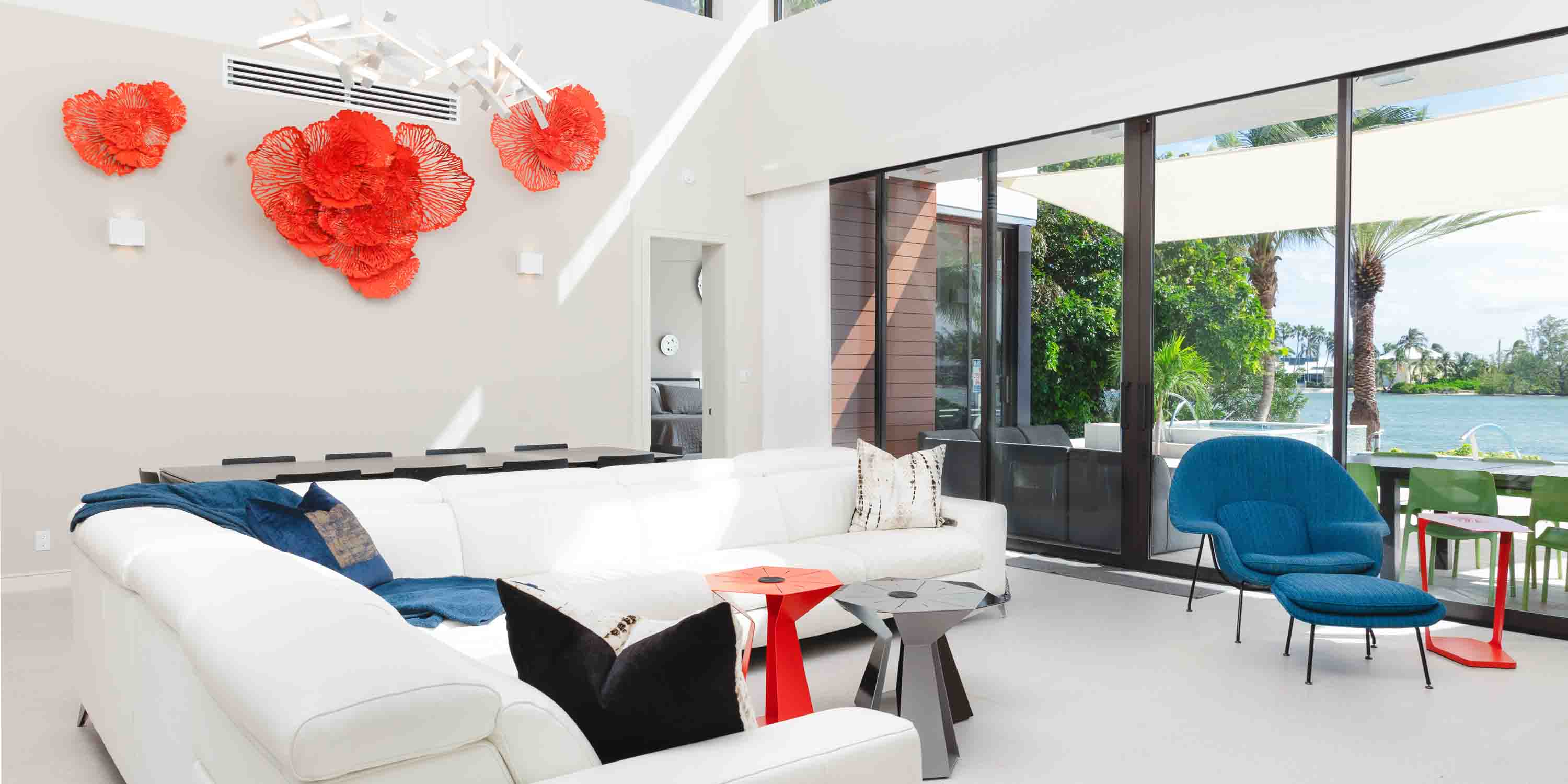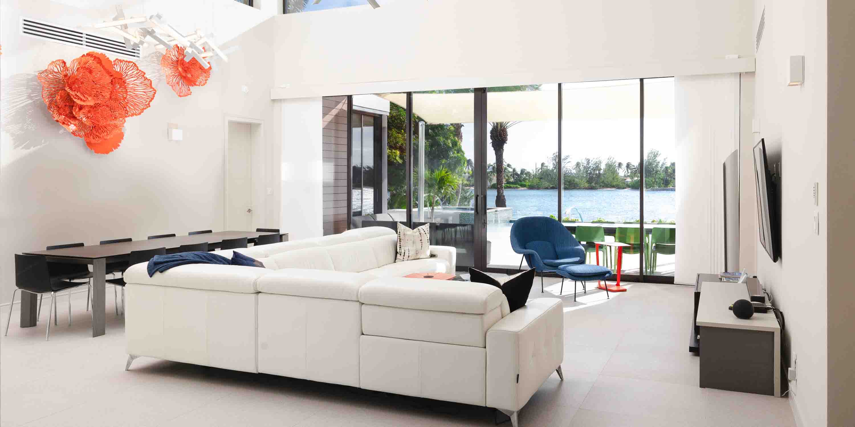 - Large great room with vaulted ceilings and walk-out access to the pool deck, outdoor dining area, and quiet cove behind the villa.