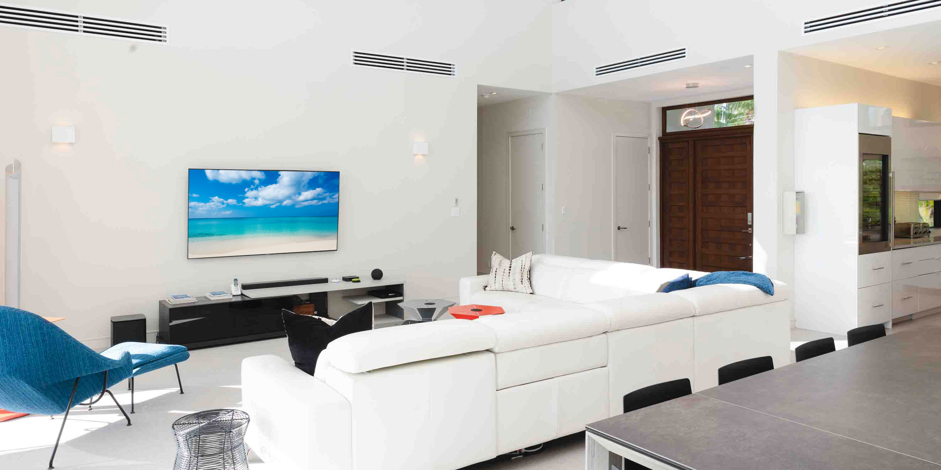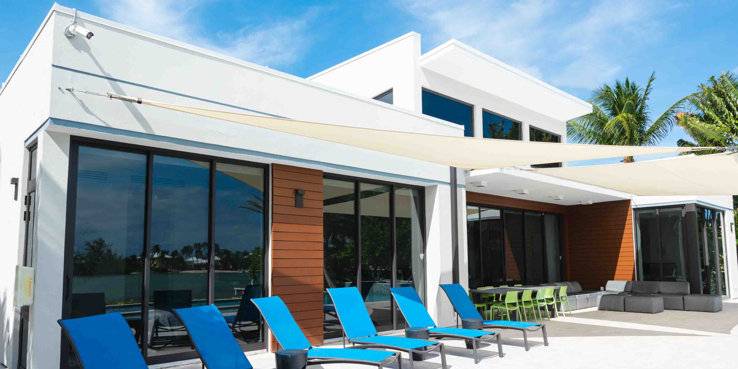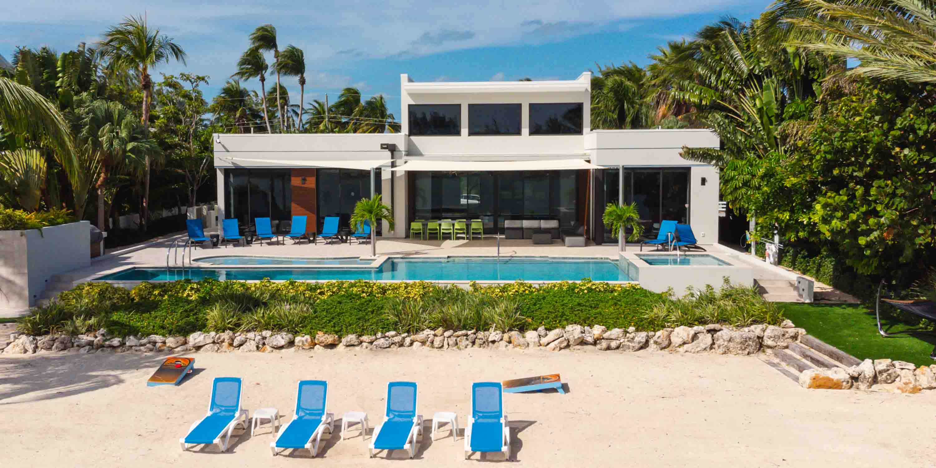 - Large great room with vaulted ceilings and walk-out access to the pool deck, outdoor dining area, and quiet cove behind the villa.
