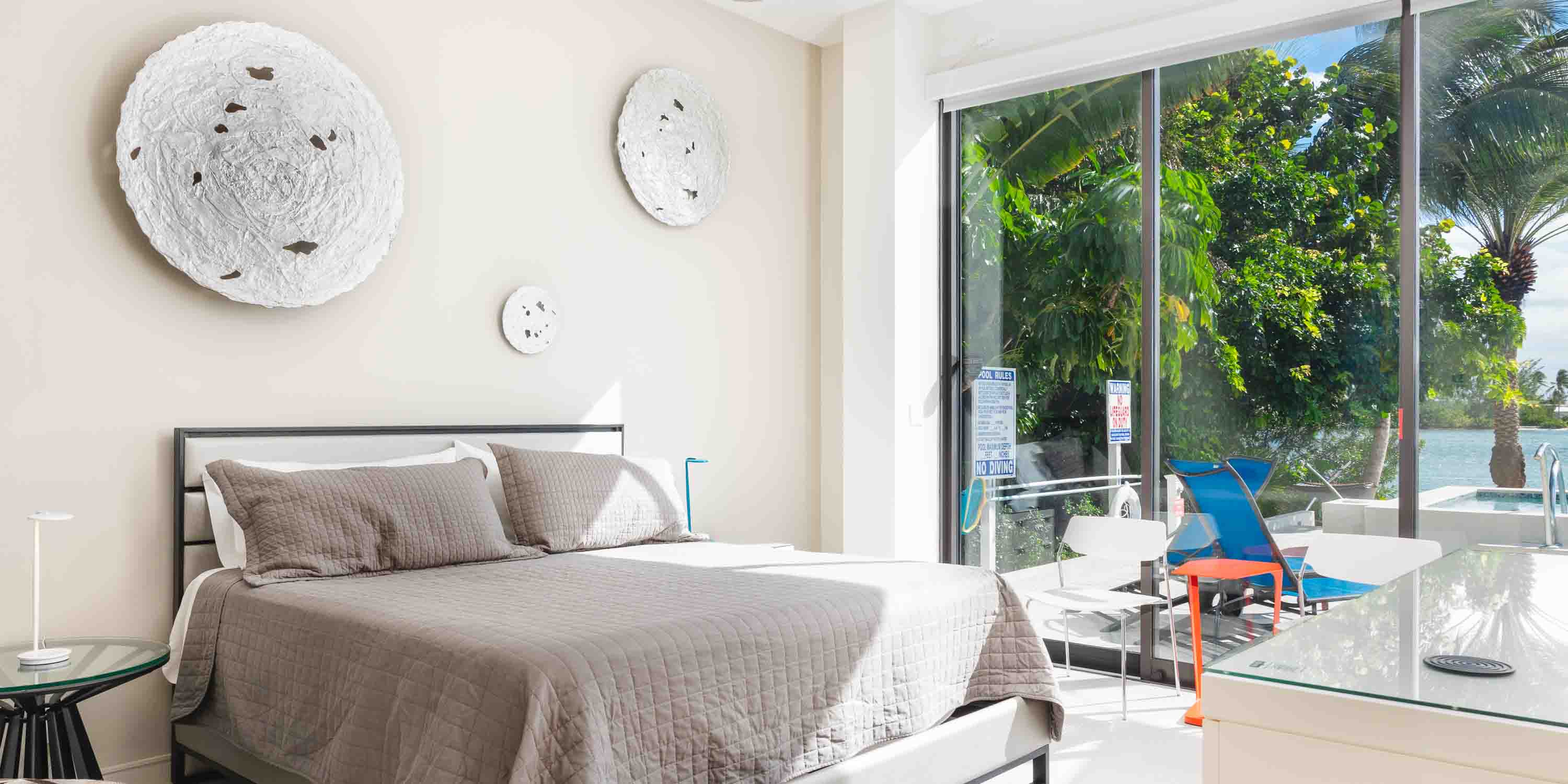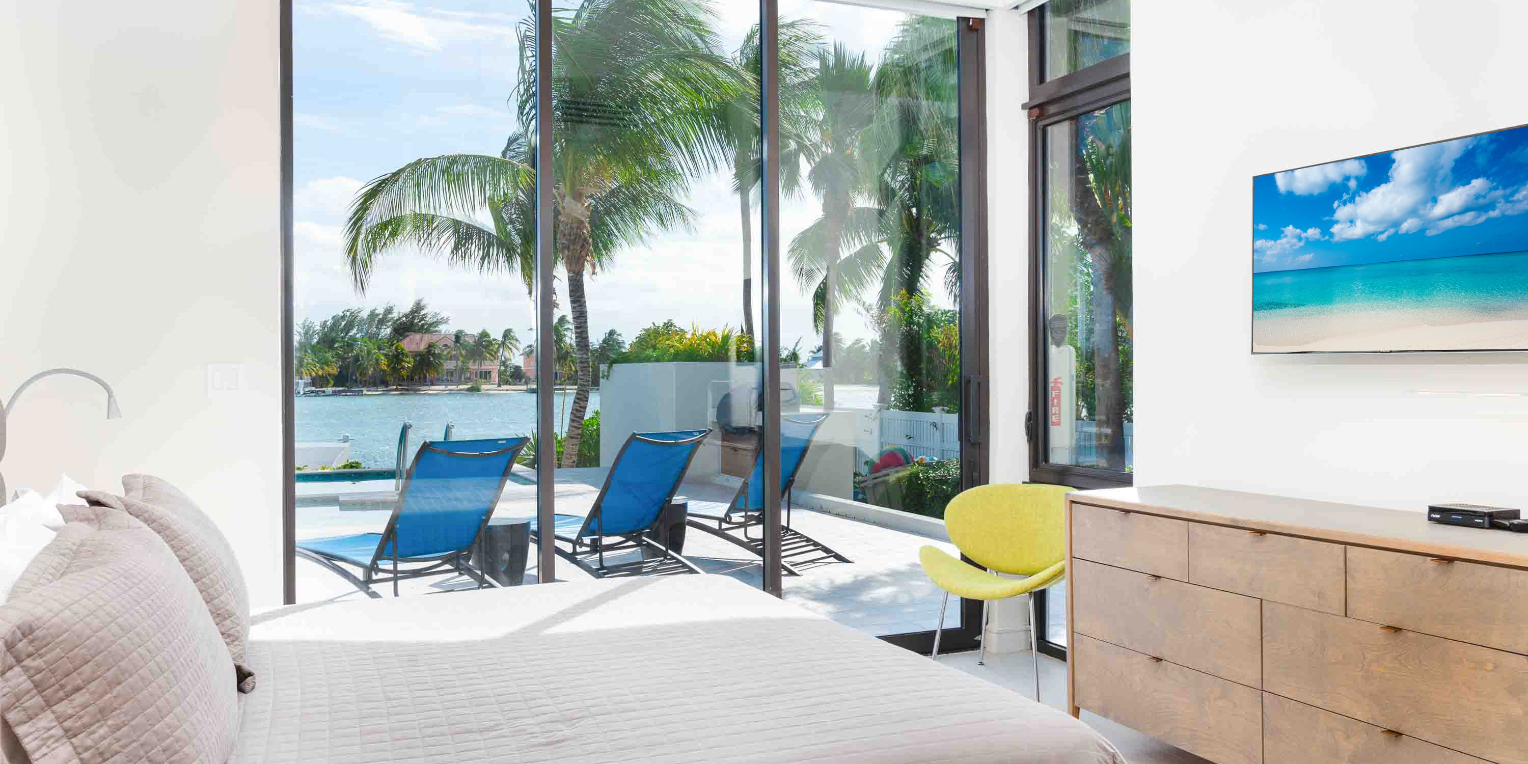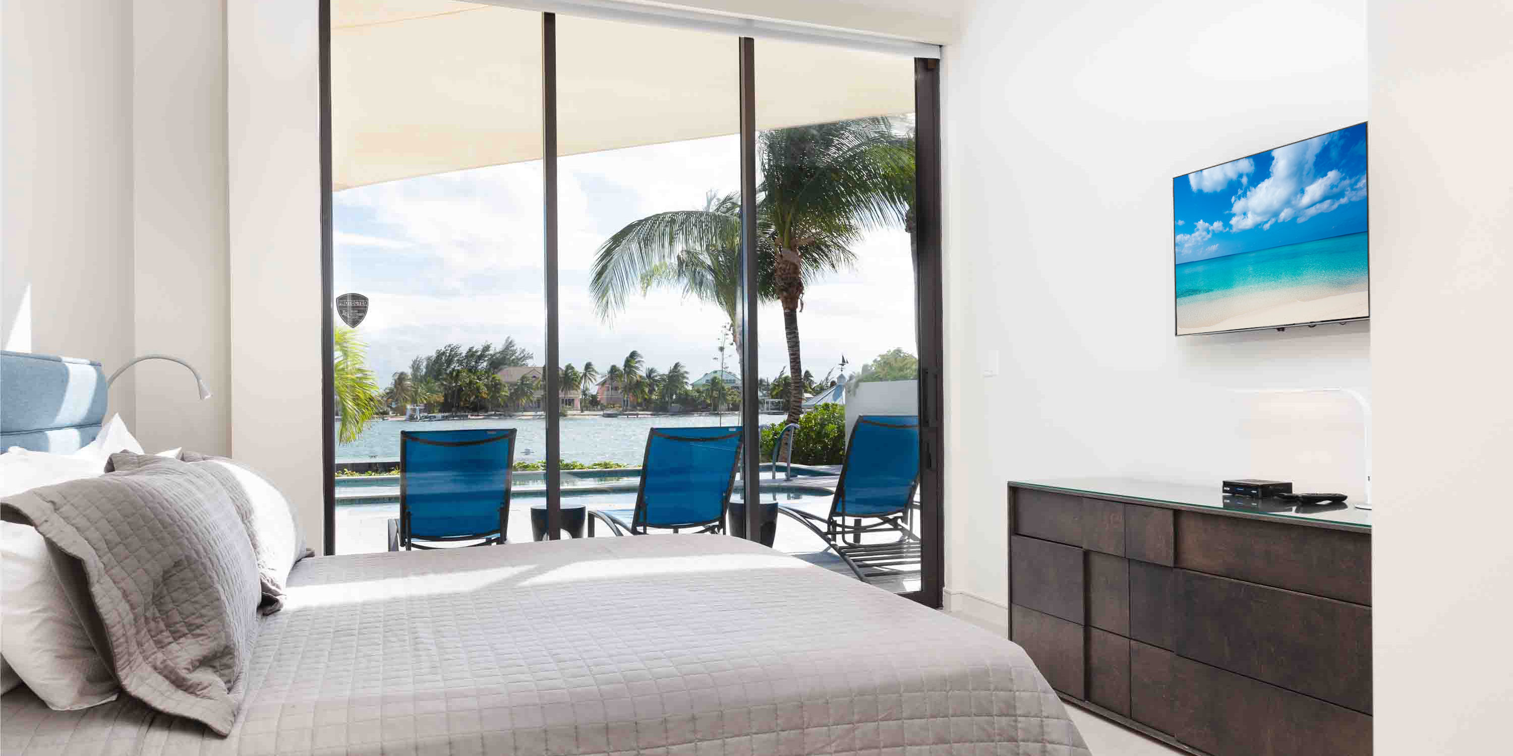 - Bedroom #3 - king bed, water views, walk-out access to the pool deck, television, ensuite with dual vanity, and shower.