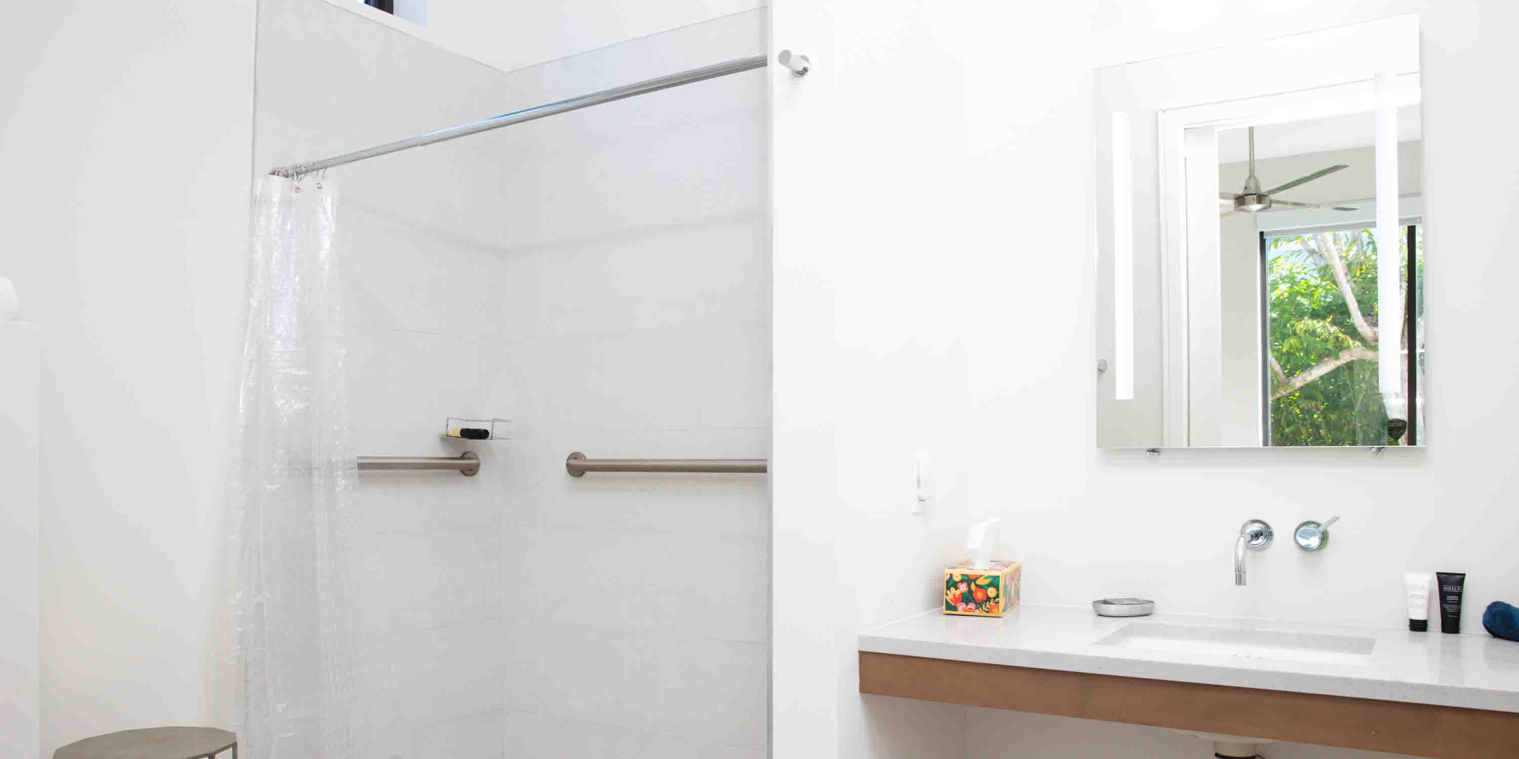 - Wheelchair entry ramp along the side door; handicap-accessible shower in the twin-bedroom suite.