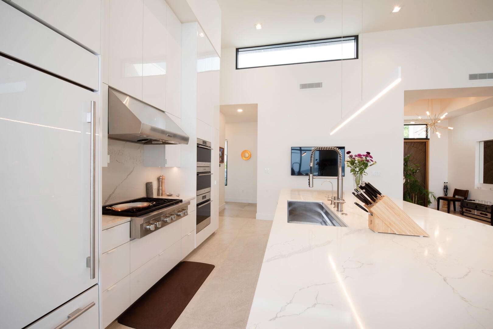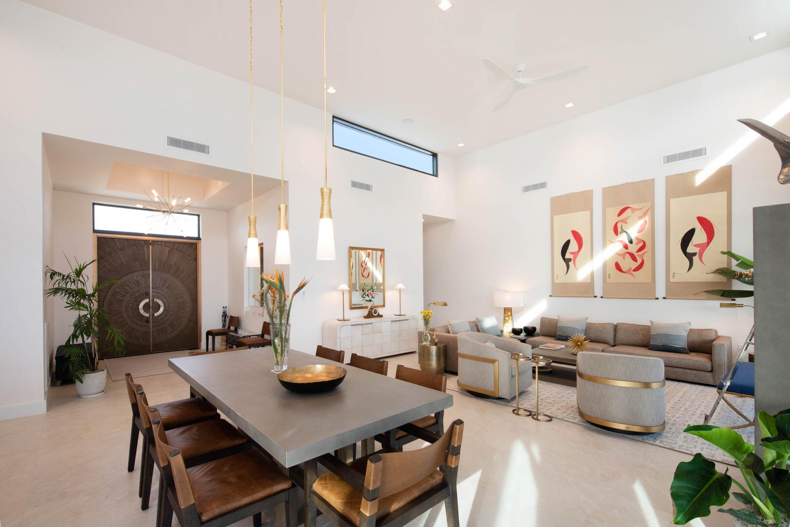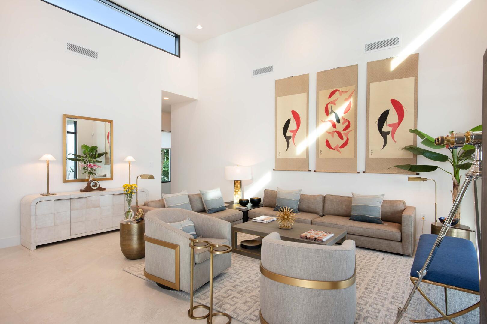 The open-concept great room is the central focal point of the home with modern furniture, a formal dining table, and a dreamy gourmet kitchen. The vaulted ceilings dramatically accentuate the space while allowing natural light to fill the room. In-ceiling speakers with Sonos audio keep the vibe going throughout the great room, primary suite, fitness room, and outdoor lanai.