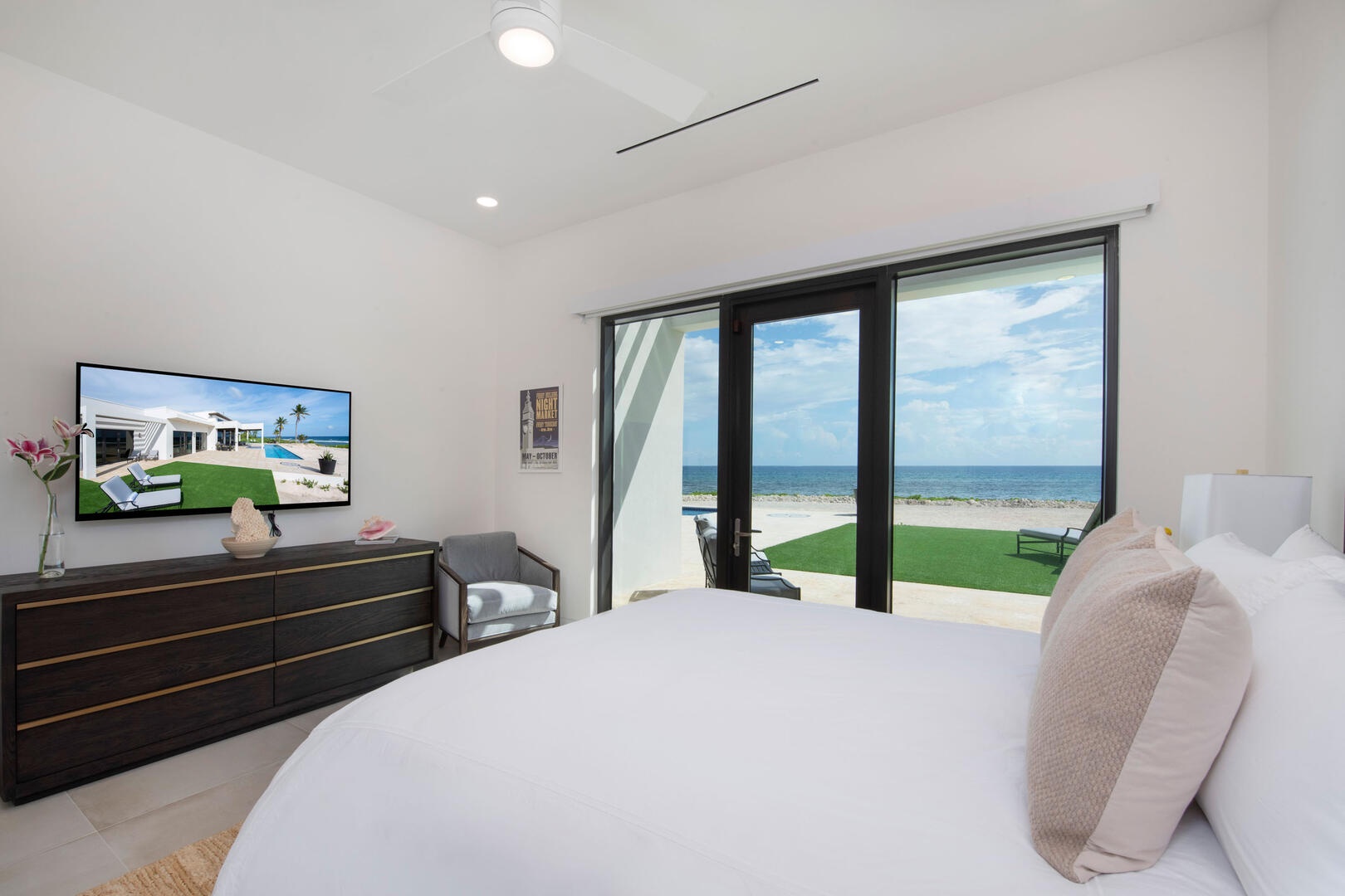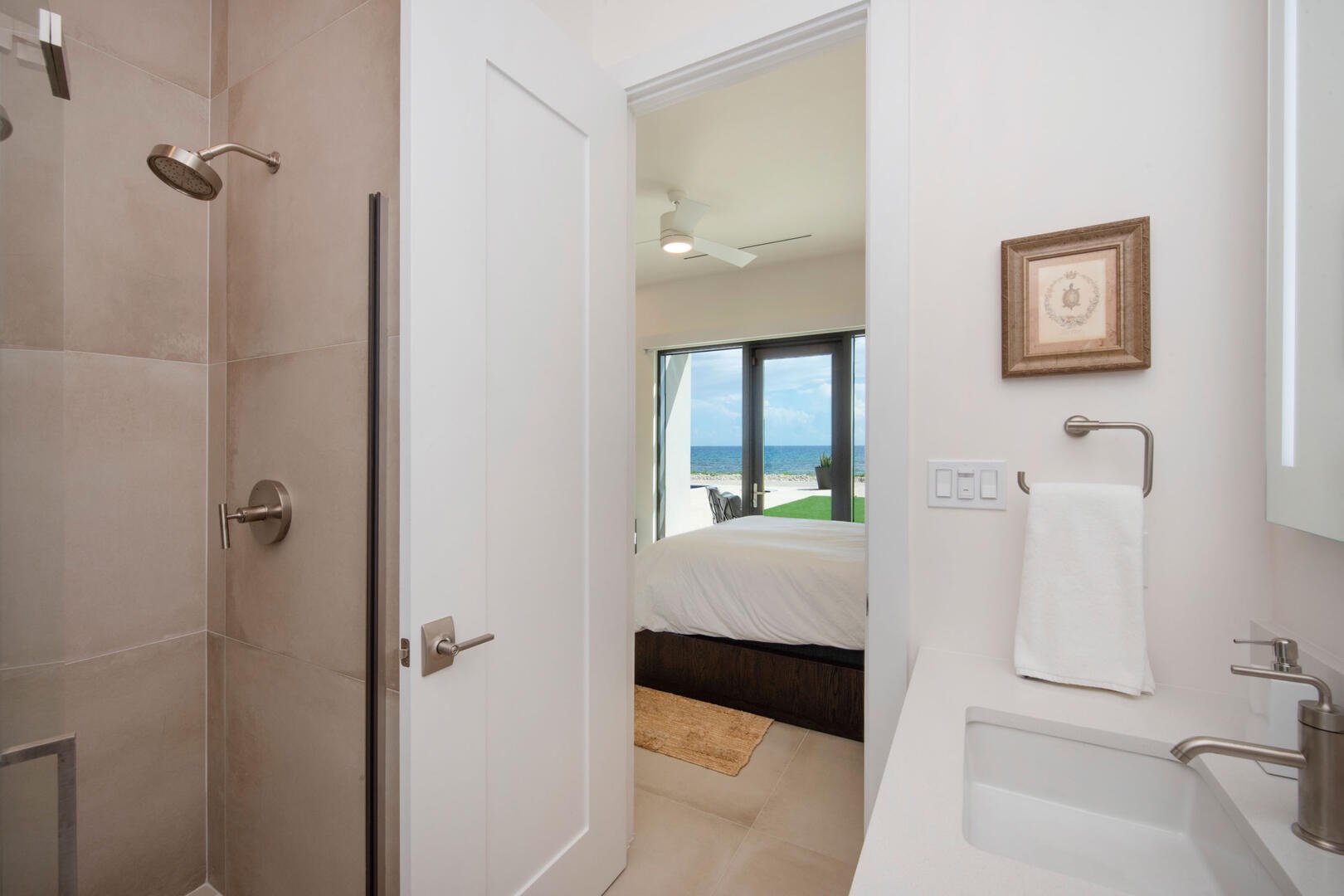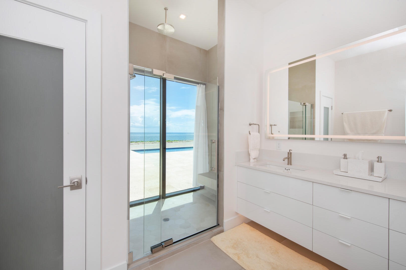 - Primary Suite - king bed, oceanfront, television, walk-out access to the pool deck, ensuite bath with dual vanity, water closet, and walk-in oceanview shower with rainfall shower head.