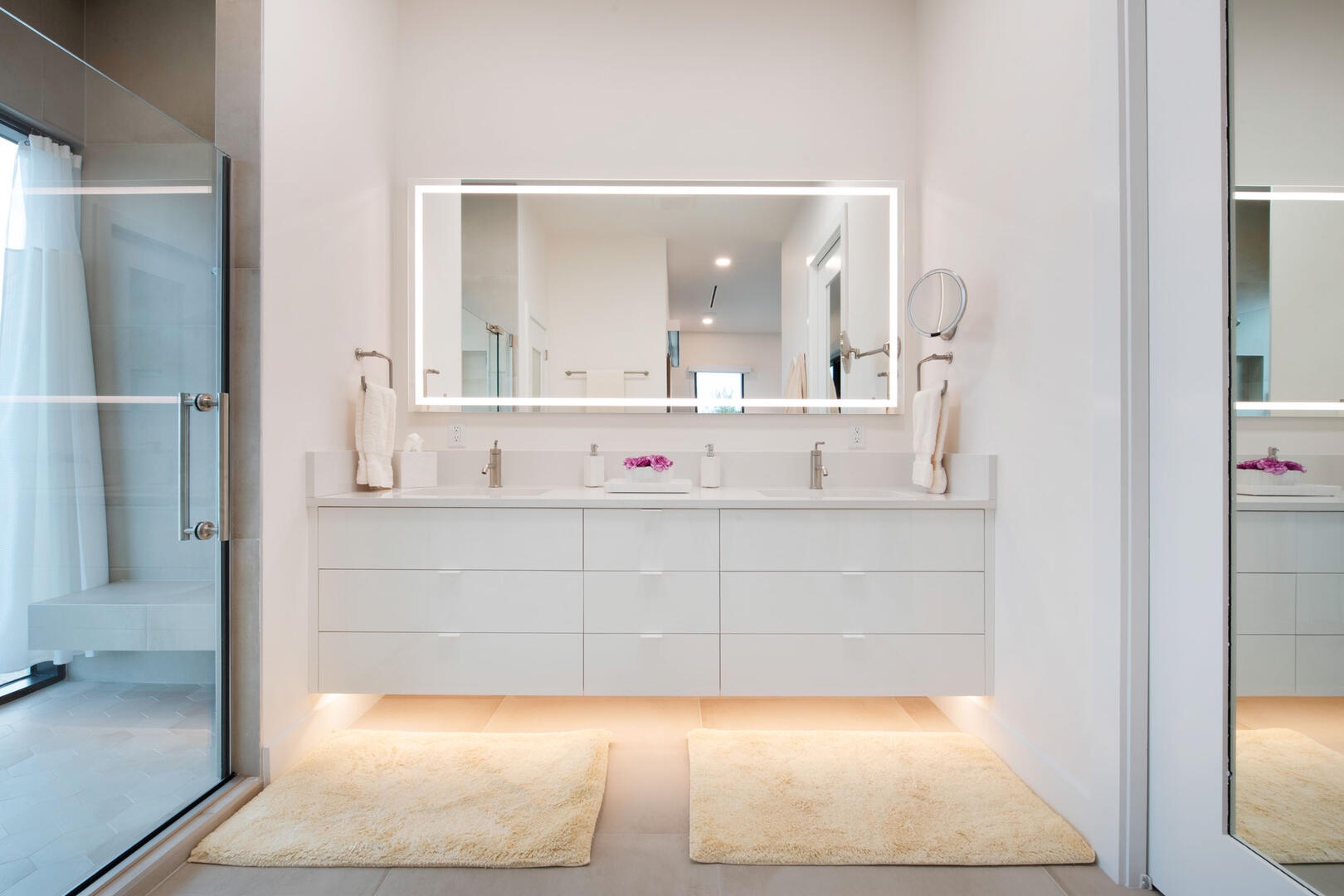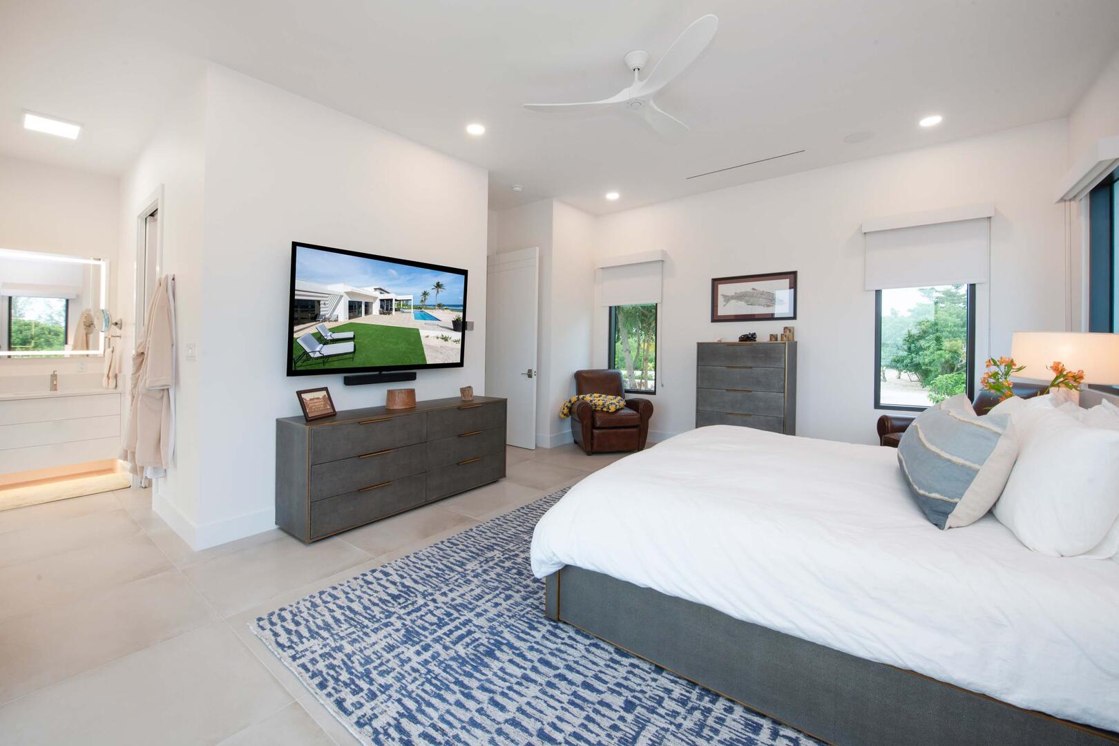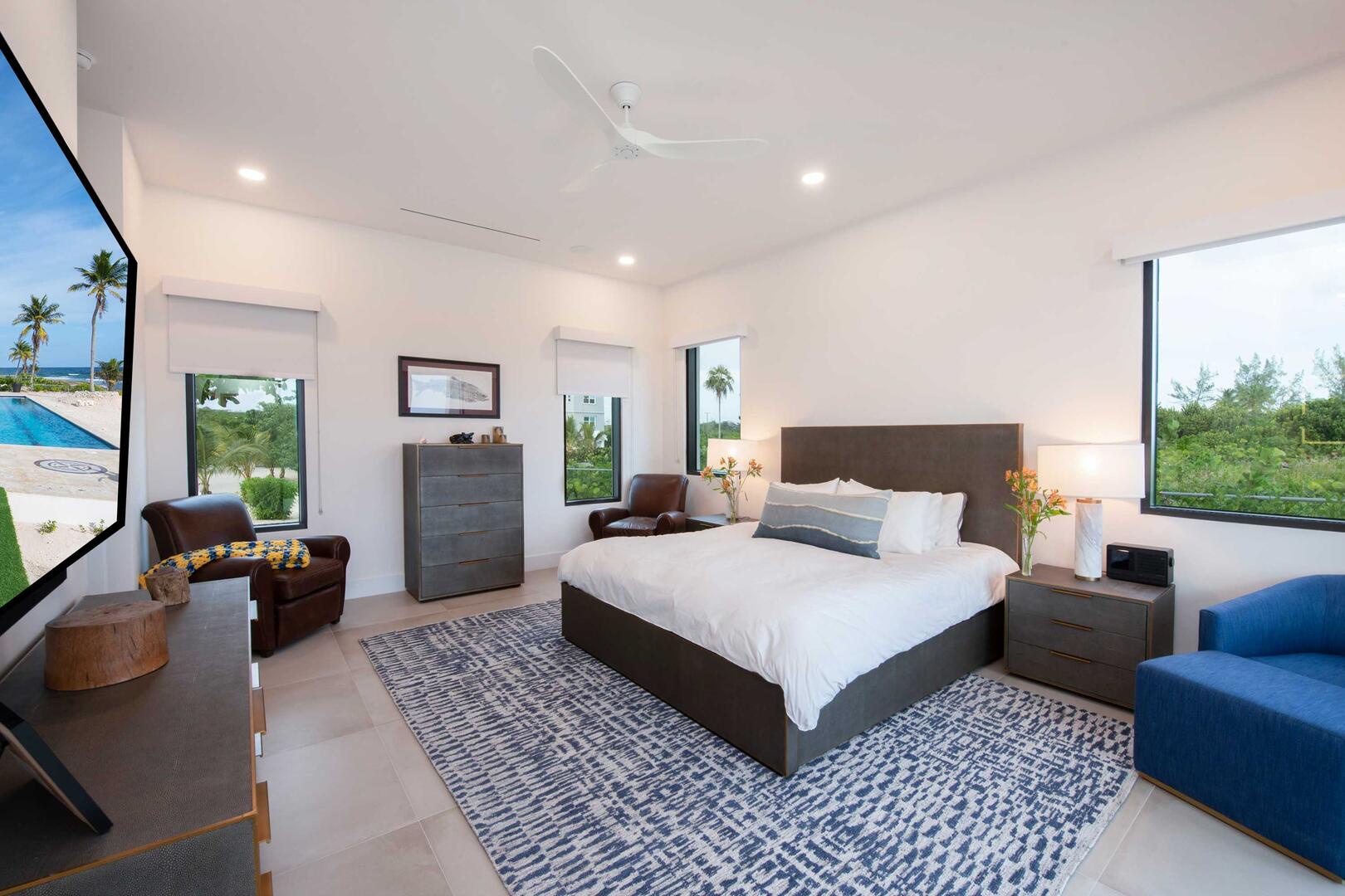 - Primary Suite - king bed, oceanfront, television, walk-out access to the pool deck, ensuite bath with dual vanity, water closet, and walk-in oceanview shower with rainfall shower head.