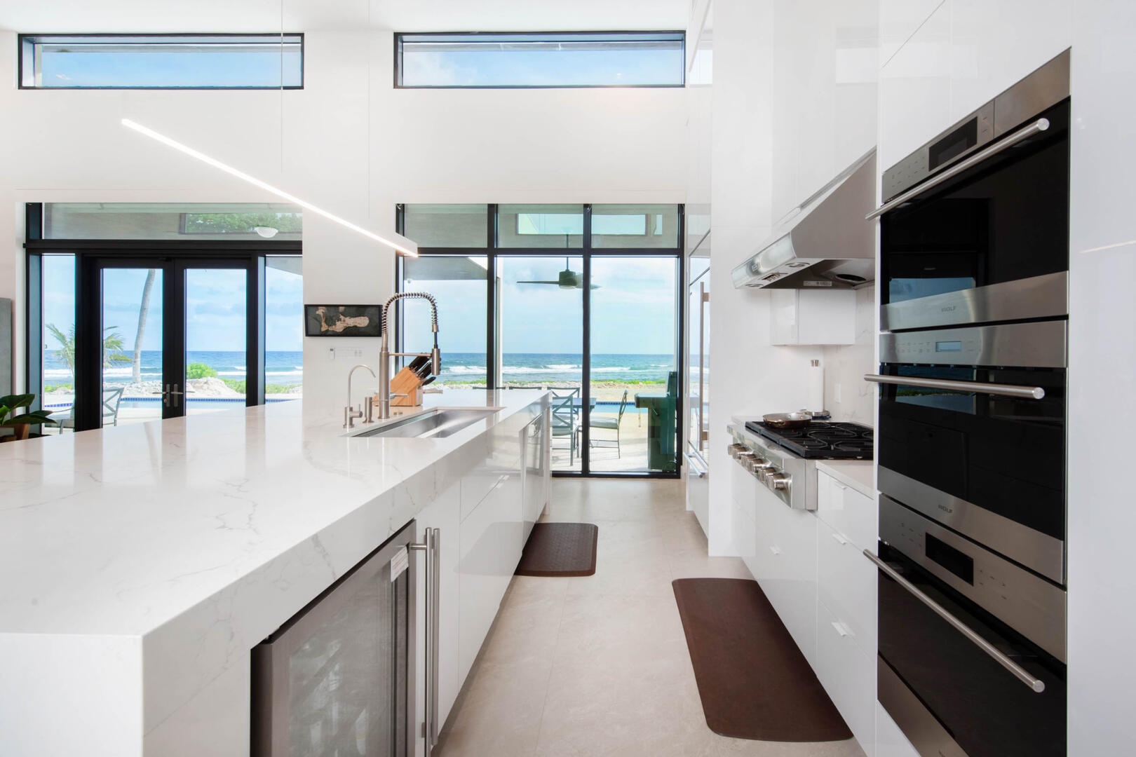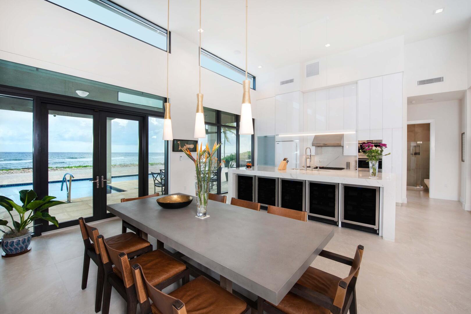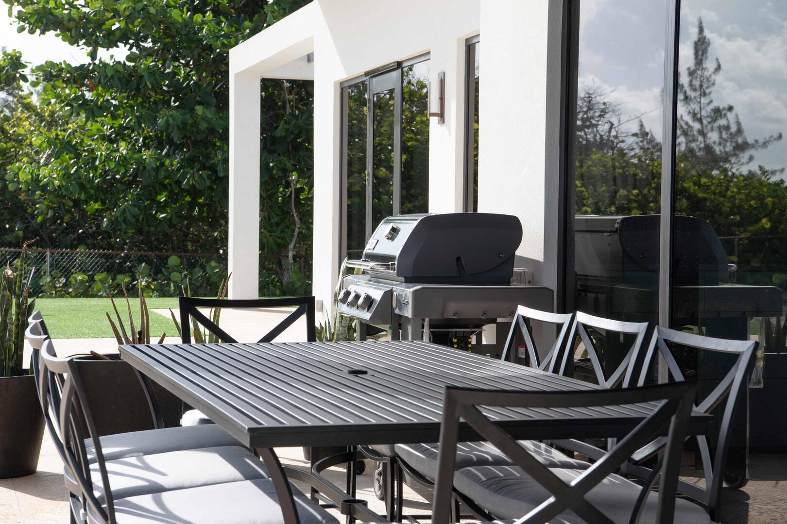 Wolf/Sub-Zero appliances are perfect for hiring a private chef or pre-stocking the home with your choice of groceries and beverages. A propane grill and outdoor dining table sit on the pool deck for alfresco sunset dinners.