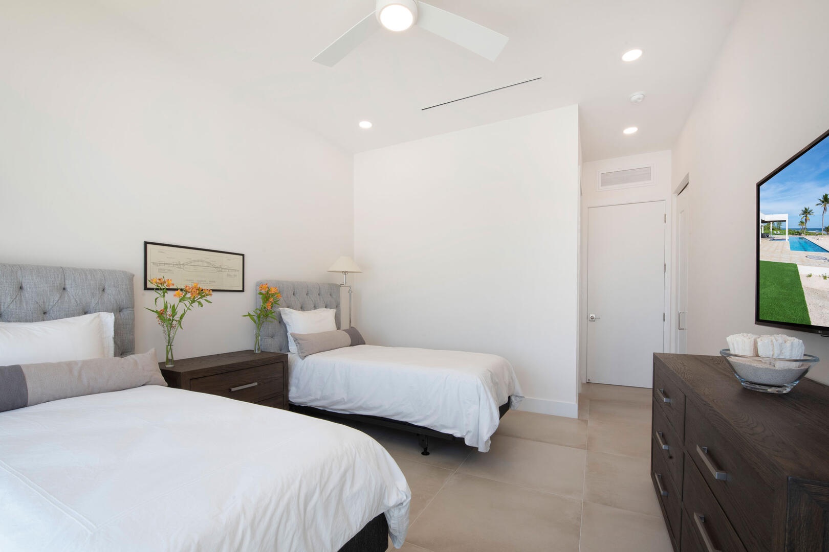 - Middle Suite - two twin beds, oceanfront, television, walk-out access to the pool deck, ensuite bath with shower bath; twin beds can be fitted into a king bed upon request.